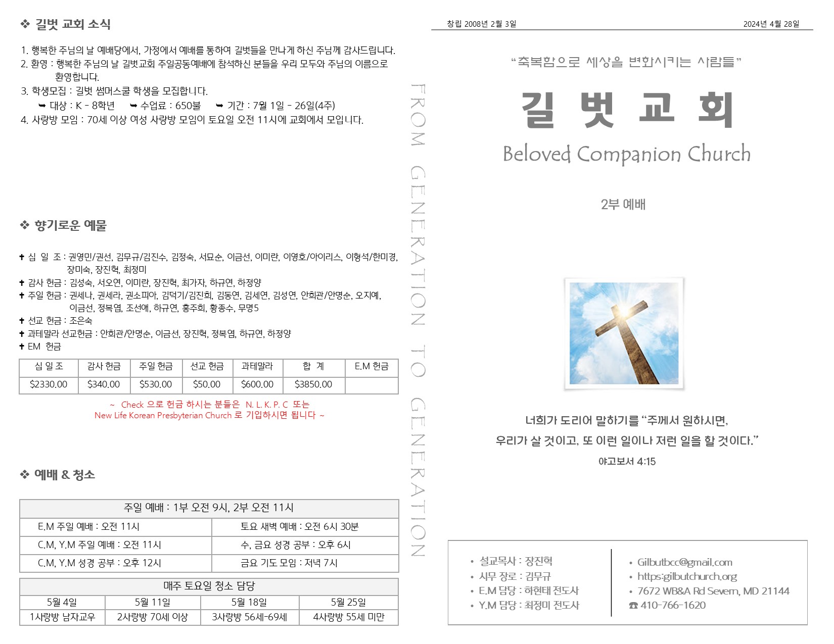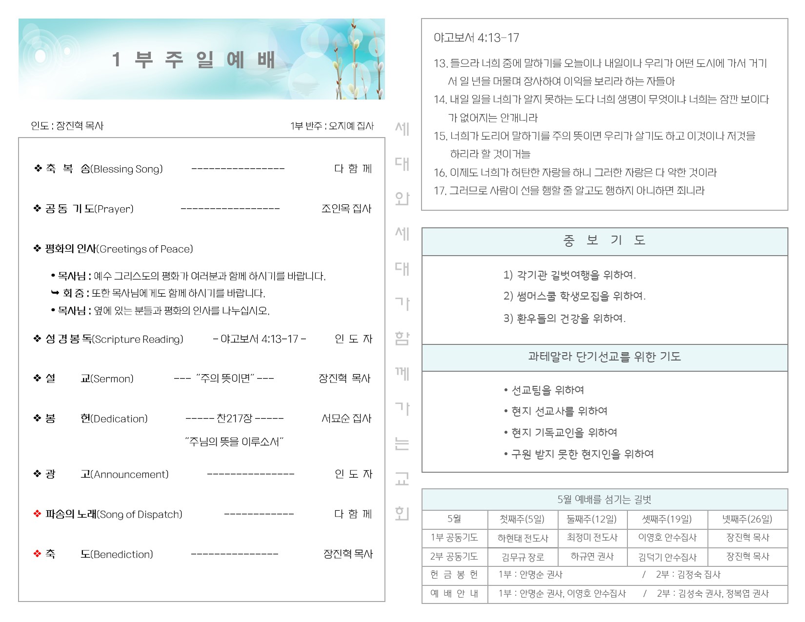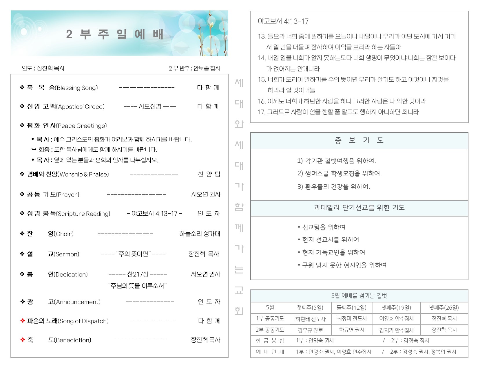 4월 28일 주일 예배 주보 Publish on May 01,2024 | 길벗교회 페이지 정보 작성자 길벗교회 댓글 0건 조회 1,860회 작성일 24-05-01 03:51 목록 본문 4월 28일 주일 예배 주보 이전글5월 5일 주일 예배 주보 24.05.06 다음글4월 21일 주일 예배 주보 24.04.22 댓글 0 댓글목록 등록된 댓글이 없습니다. 목록