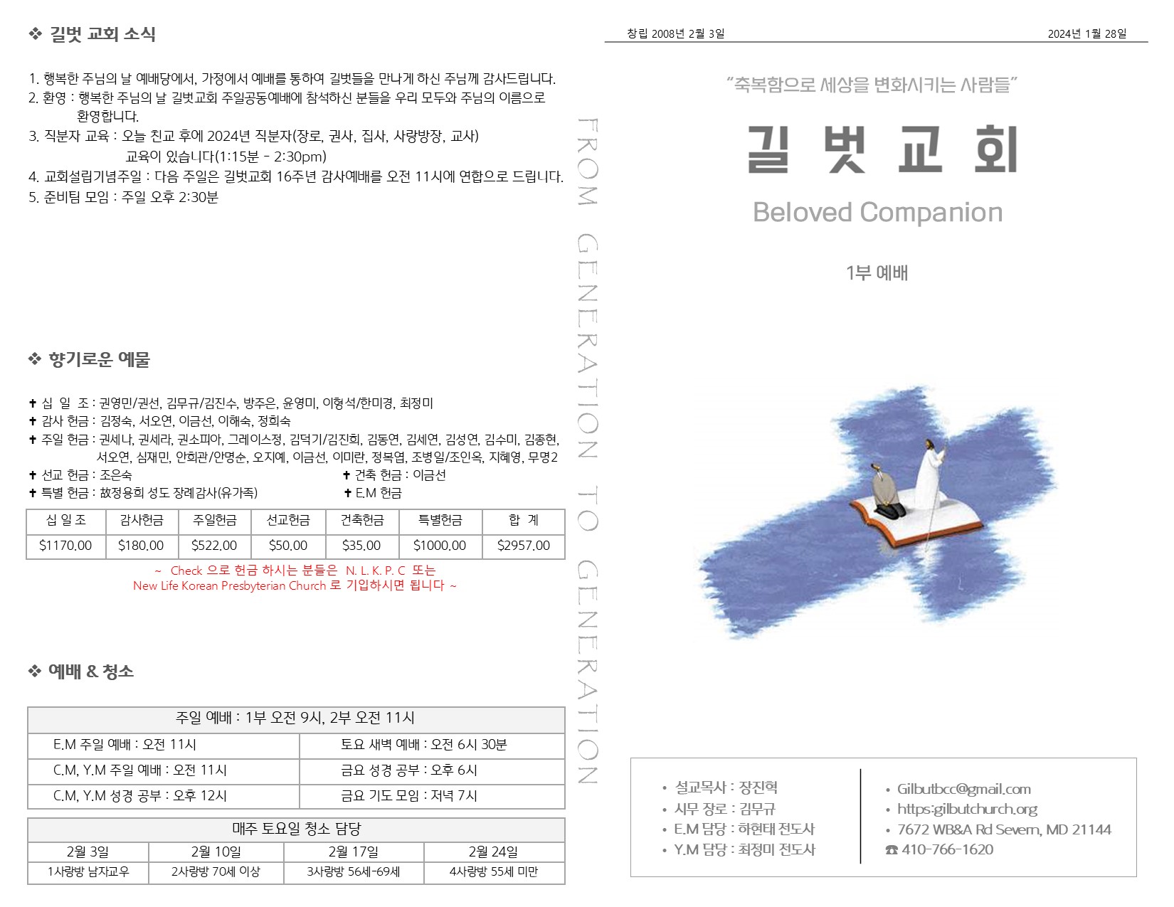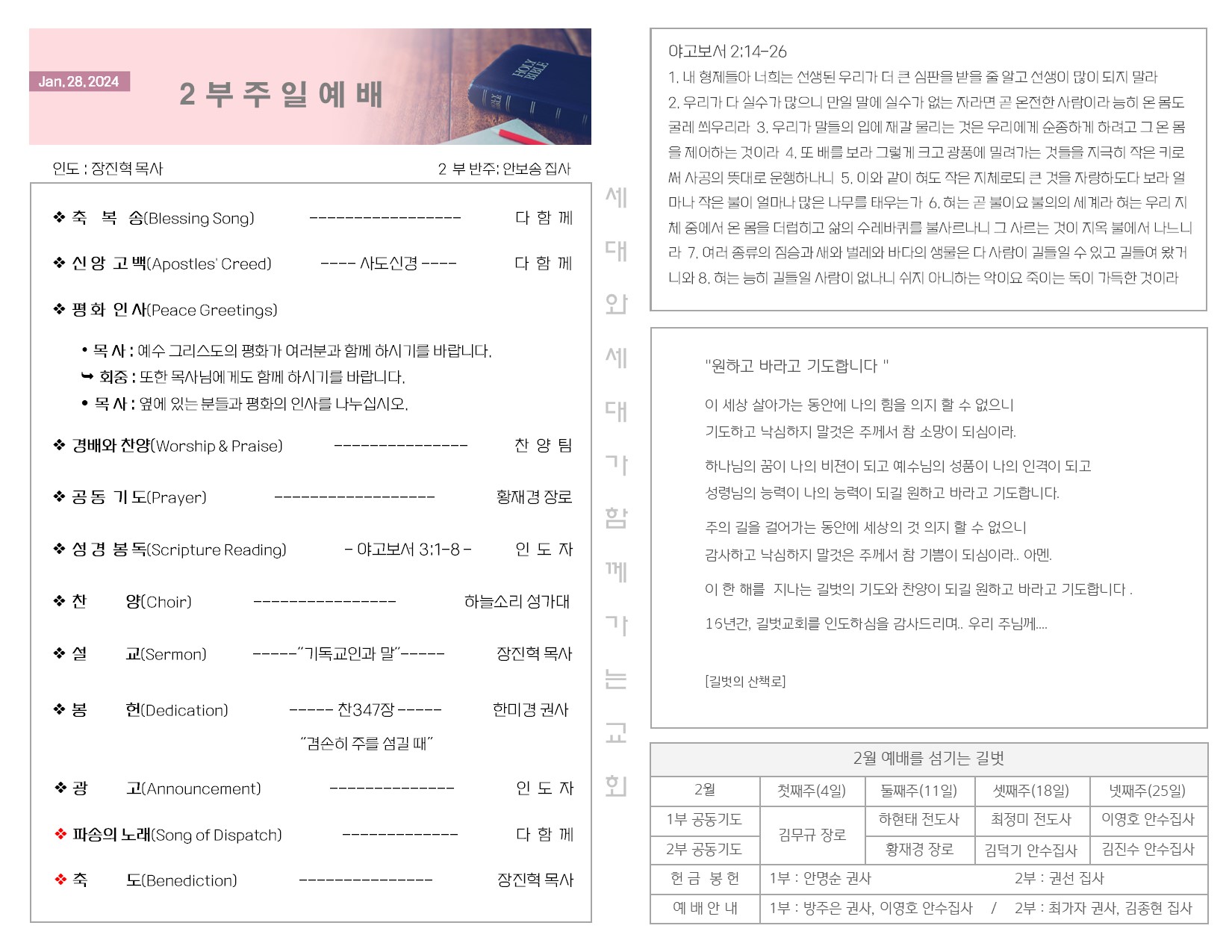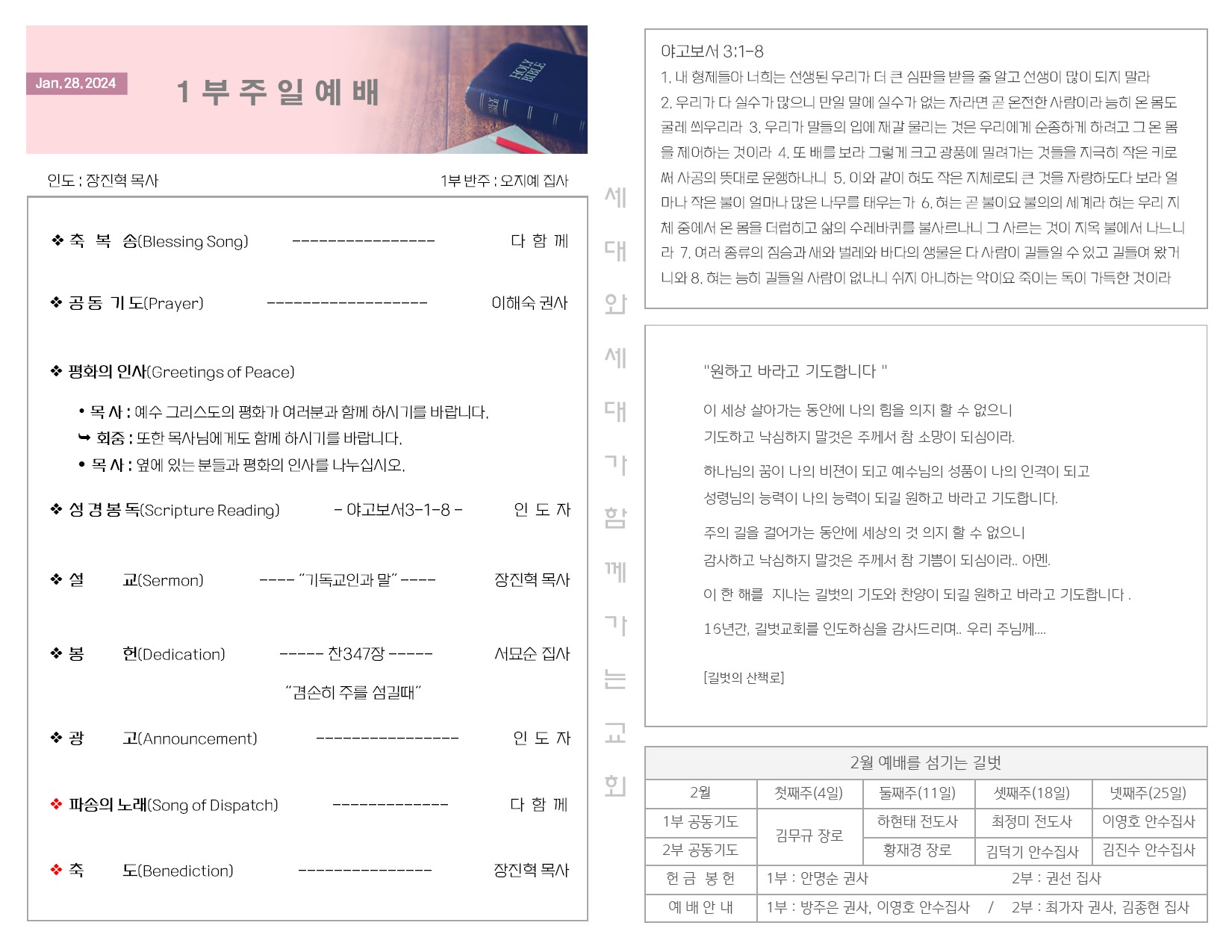 1월 28일 주일 예배 주보 Publish on January 30,2024 | 길벗교회 페이지 정보 작성자 길벗교회 댓글 0건 조회 2,203회 작성일 24-01-30 05:58 목록 본문 1월 28일 주일 예배 주보 이전글2월 4일 설립주일 예배 24.02.06 다음글1월 21일 주일 예배 주보 24.01.23 댓글 0 댓글목록 등록된 댓글이 없습니다. 목록
