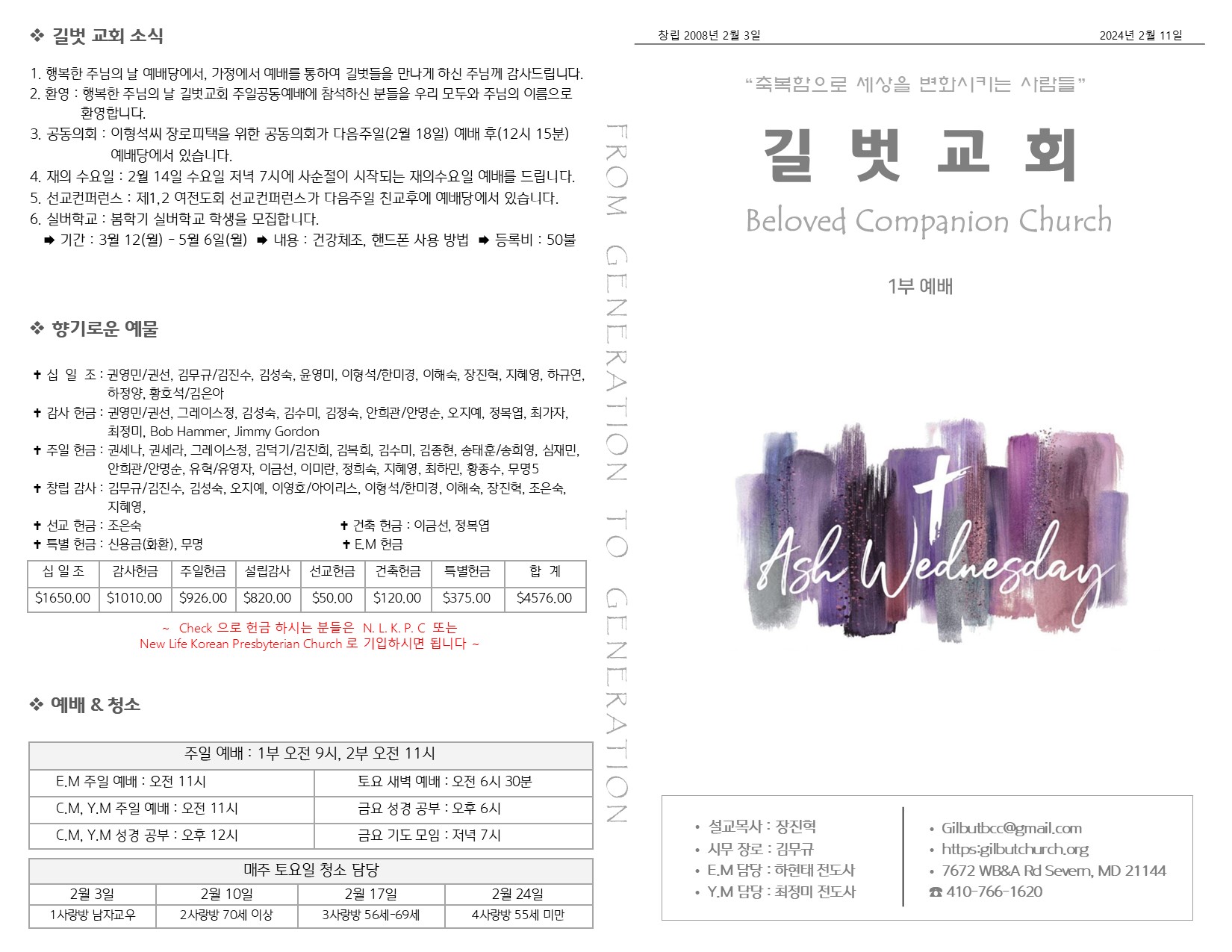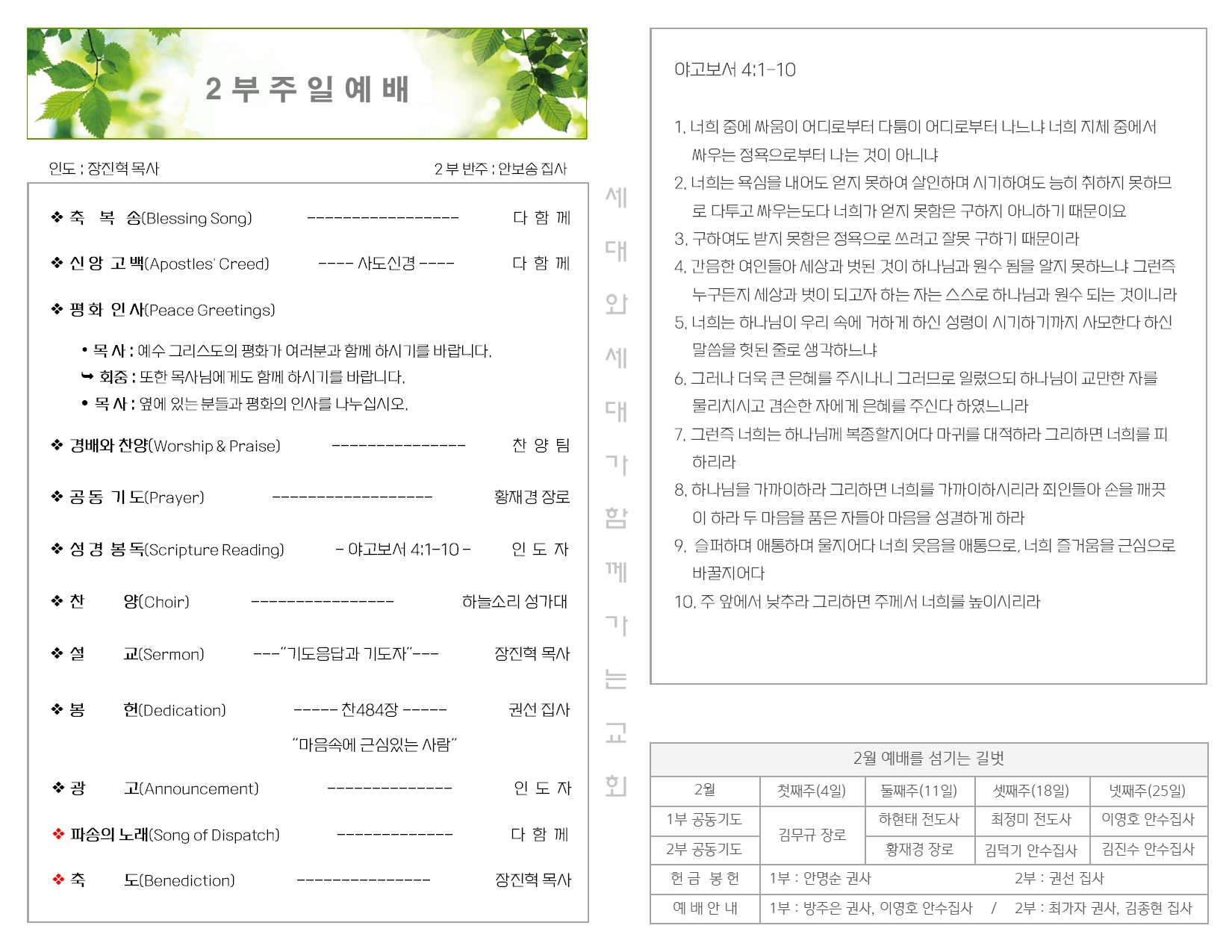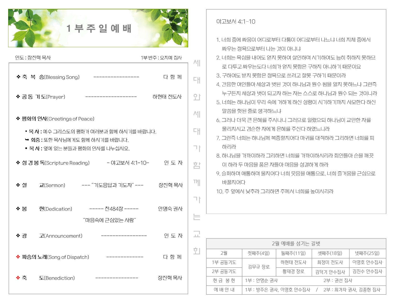 2월 11일 주일 예배 주보 Publish on February 13,2024 | 길벗교회 페이지 정보 작성자 길벗교회 댓글 0건 조회 2,107회 작성일 24-02-13 04:59 목록 본문 2월 11일 주일 예배 주보 이전글2월 18일 주일 예배 주보 24.02.20 다음글2월 4일 설립주일 예배 24.02.06 댓글 0 댓글목록 등록된 댓글이 없습니다. 목록