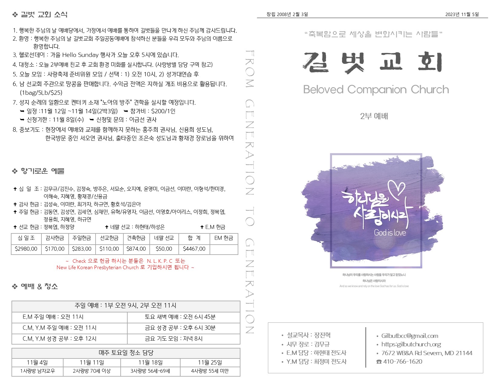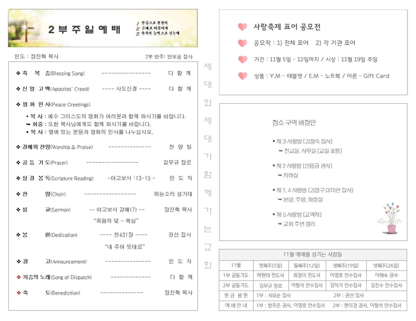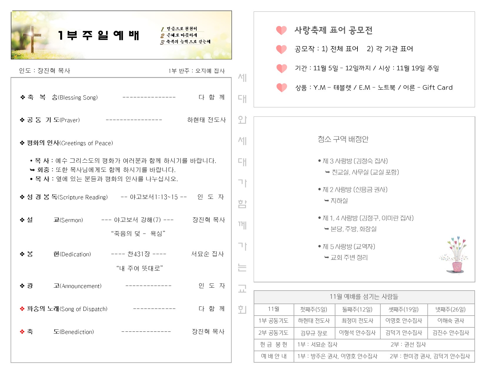 11월 5일 주일 예배 주보 Publish on November 07,2023 | 길벗교회 페이지 정보 작성자 길벗교회 댓글 0건 조회 1,847회 작성일 23-11-07 05:59 목록 본문 11월 5일 주일 예배 주보 이전글11월 12일 주일 예배 주보 23.11.15 다음글10월 29일 주일 예배 주보 23.10.31 댓글 0 댓글목록 등록된 댓글이 없습니다. 목록