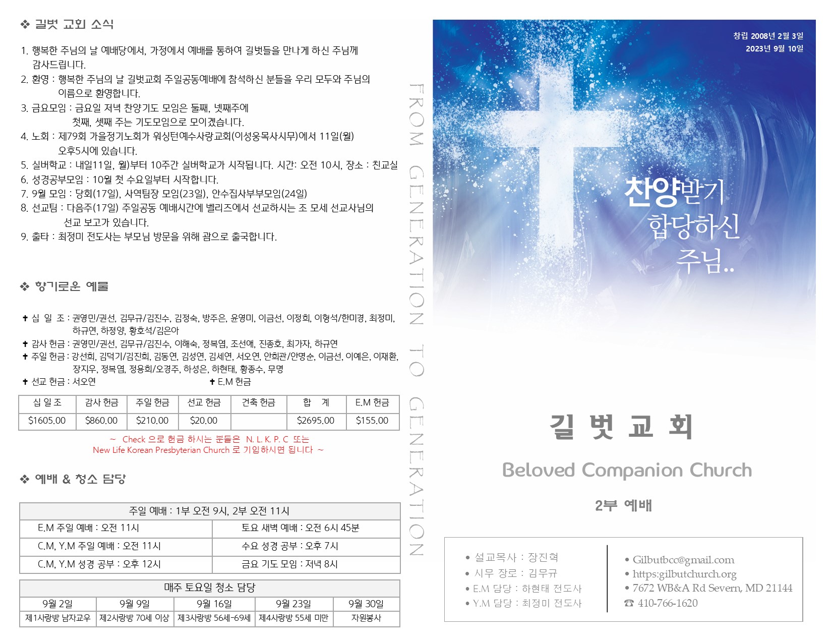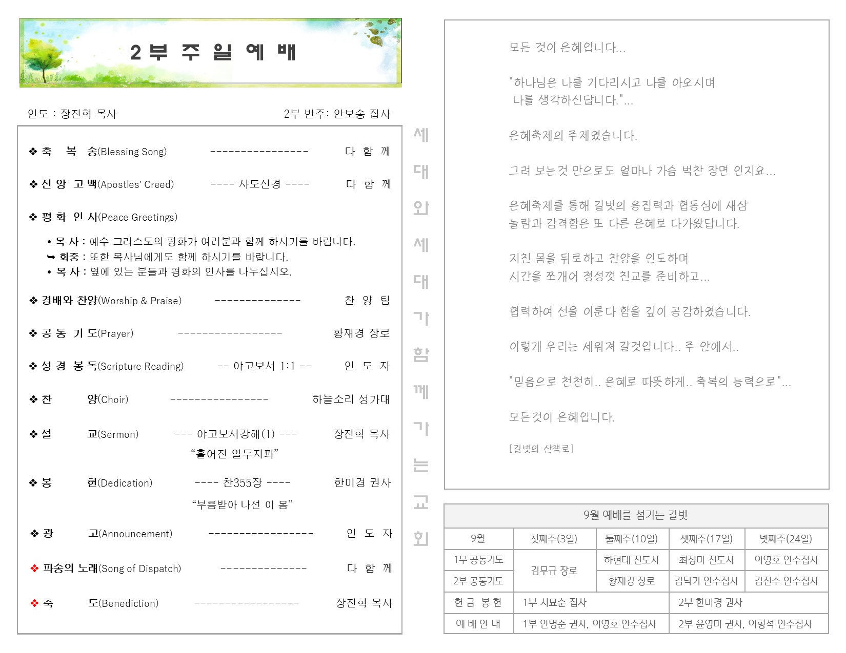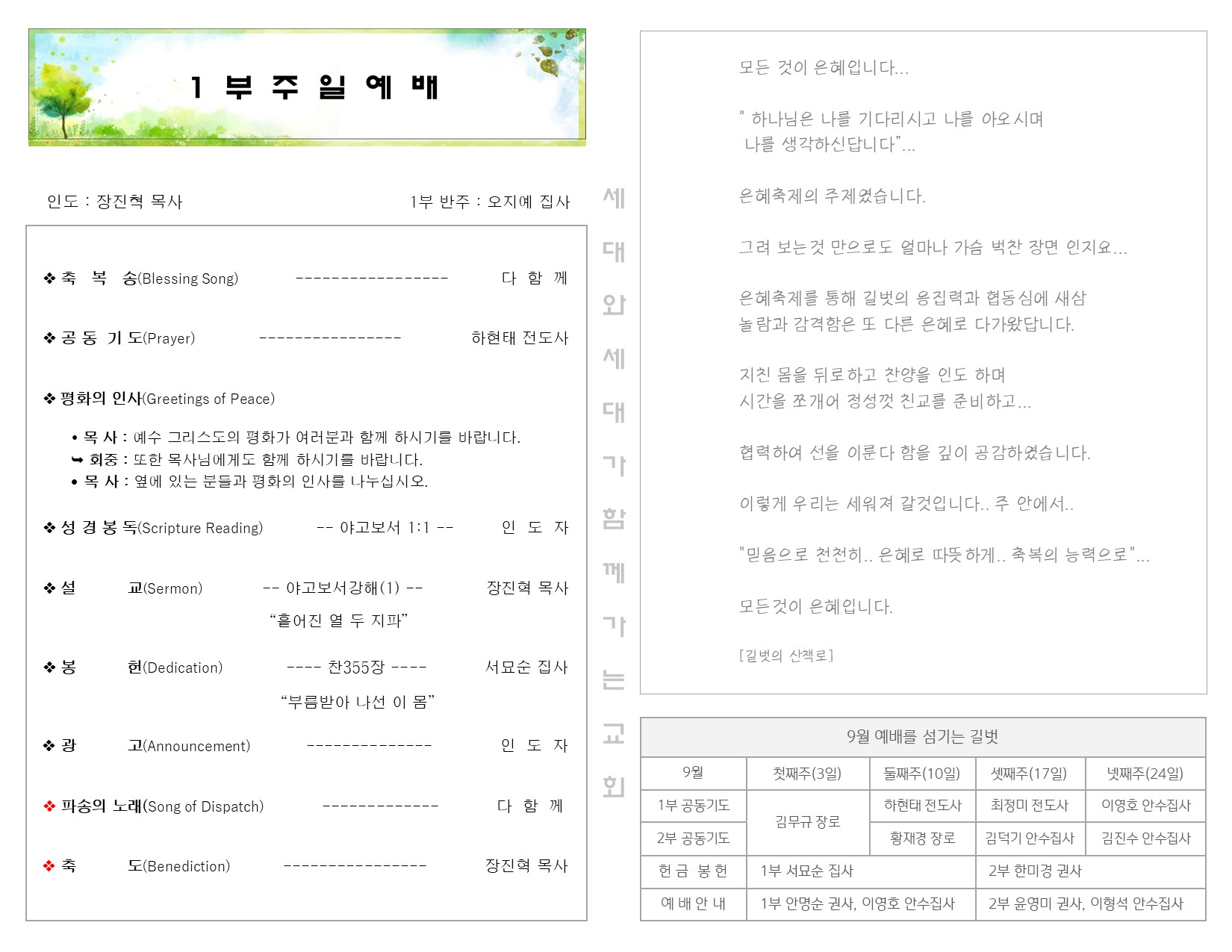 9월 10일 주일 예배 주보 Publish on September 12,2023 | 길벗교회 페이지 정보 작성자 길벗교회 댓글 0건 조회 1,615회 작성일 23-09-12 12:59 목록 본문 9월 10일 주일 예배 주보 이전글9월 17일 주일 예배 주보 23.09.20 다음글9월 3일 주일 예배 주보 23.09.06 댓글 0 댓글목록 등록된 댓글이 없습니다. 목록