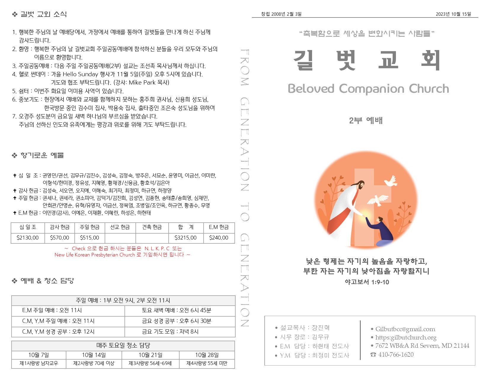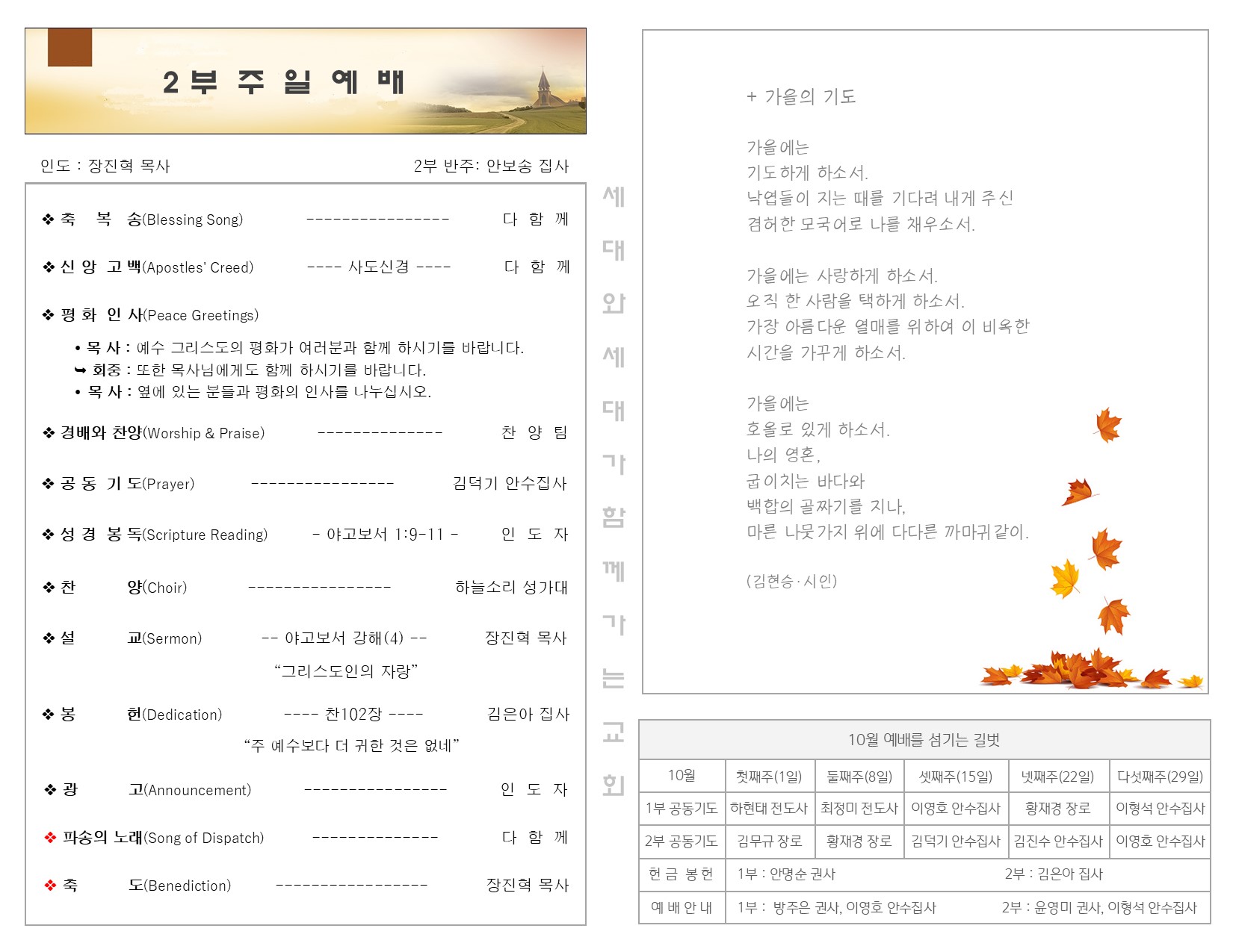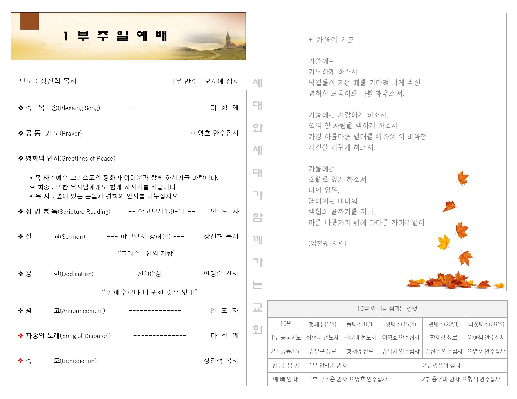 10월 15일 주일 예배 주보 Publish on October 24,2023 | 길벗교회 페이지 정보 작성자 길벗교회 댓글 0건 조회 1,940회 작성일 23-10-24 04:08 목록 본문 10월 15일 주일 예배 주 이전글10월 22일 주일 예배 주보 23.10.24 다음글10월 8일 주일 예배 주보 23.10.10 댓글 0 댓글목록 등록된 댓글이 없습니다. 목록