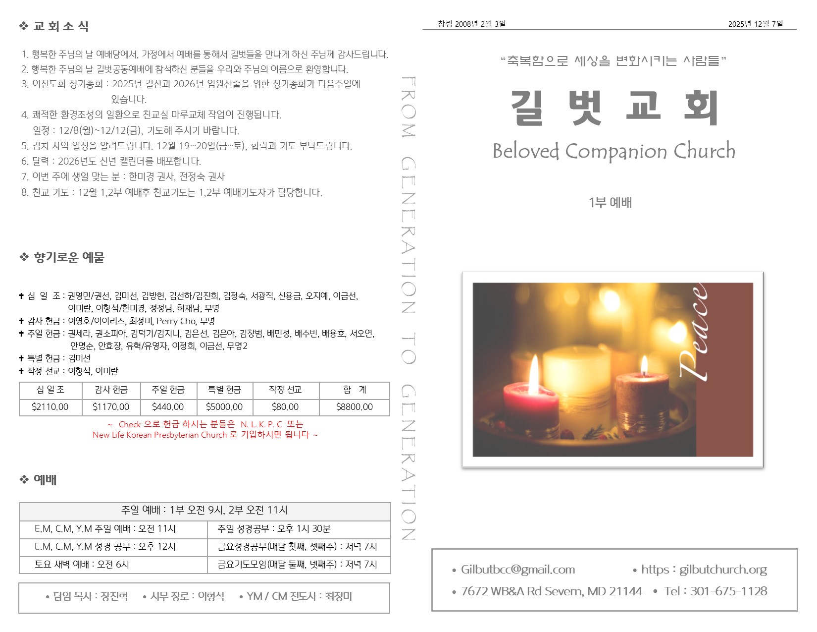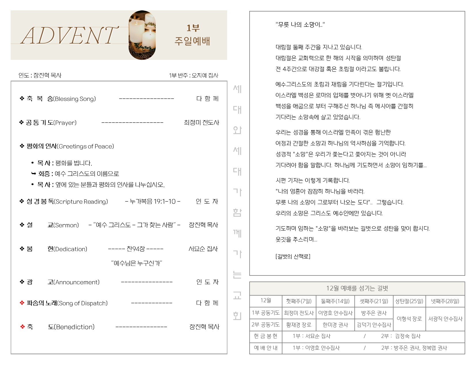 12월 7일 주일 예배 주보 Publish on December 09,2025 | 길벗교회 페이지 정보 작성자 길벗교회 댓글 0건 조회 181회 작성일 25-12-09 11:29 목록 본문 12월 7일 주일 예배 주보 이전글12월 14일 주일 예배 주보 25.12.17 다음글11월 30일 주일 예배 주보 25.12.02 댓글 0 댓글목록 등록된 댓글이 없습니다. 목록