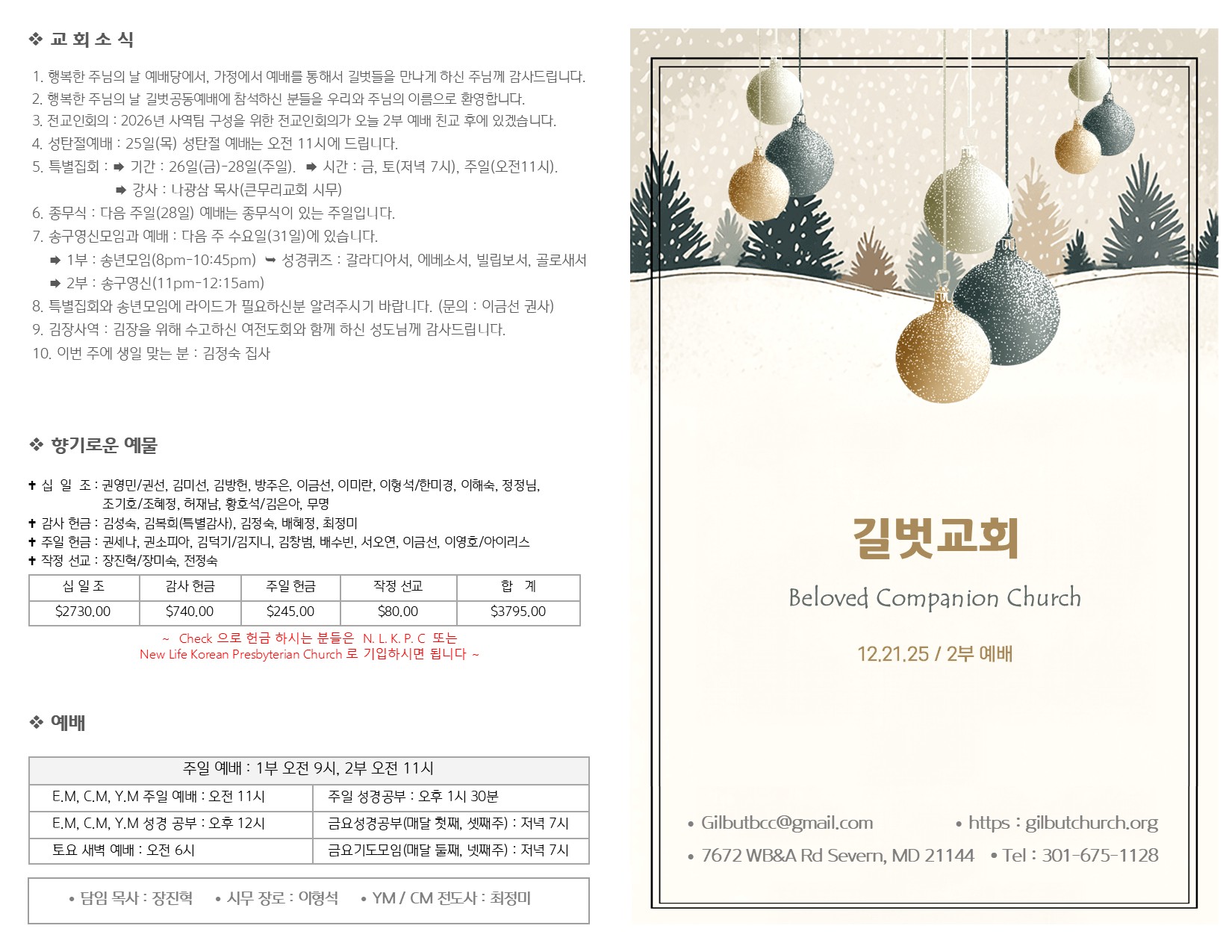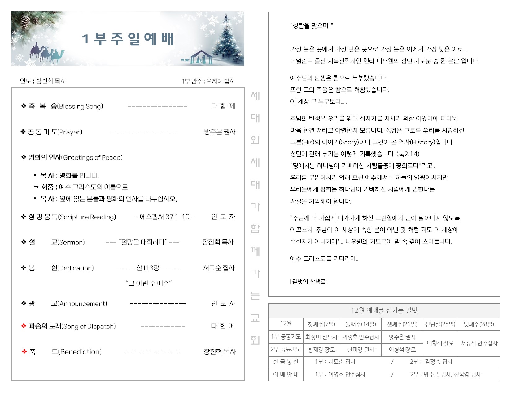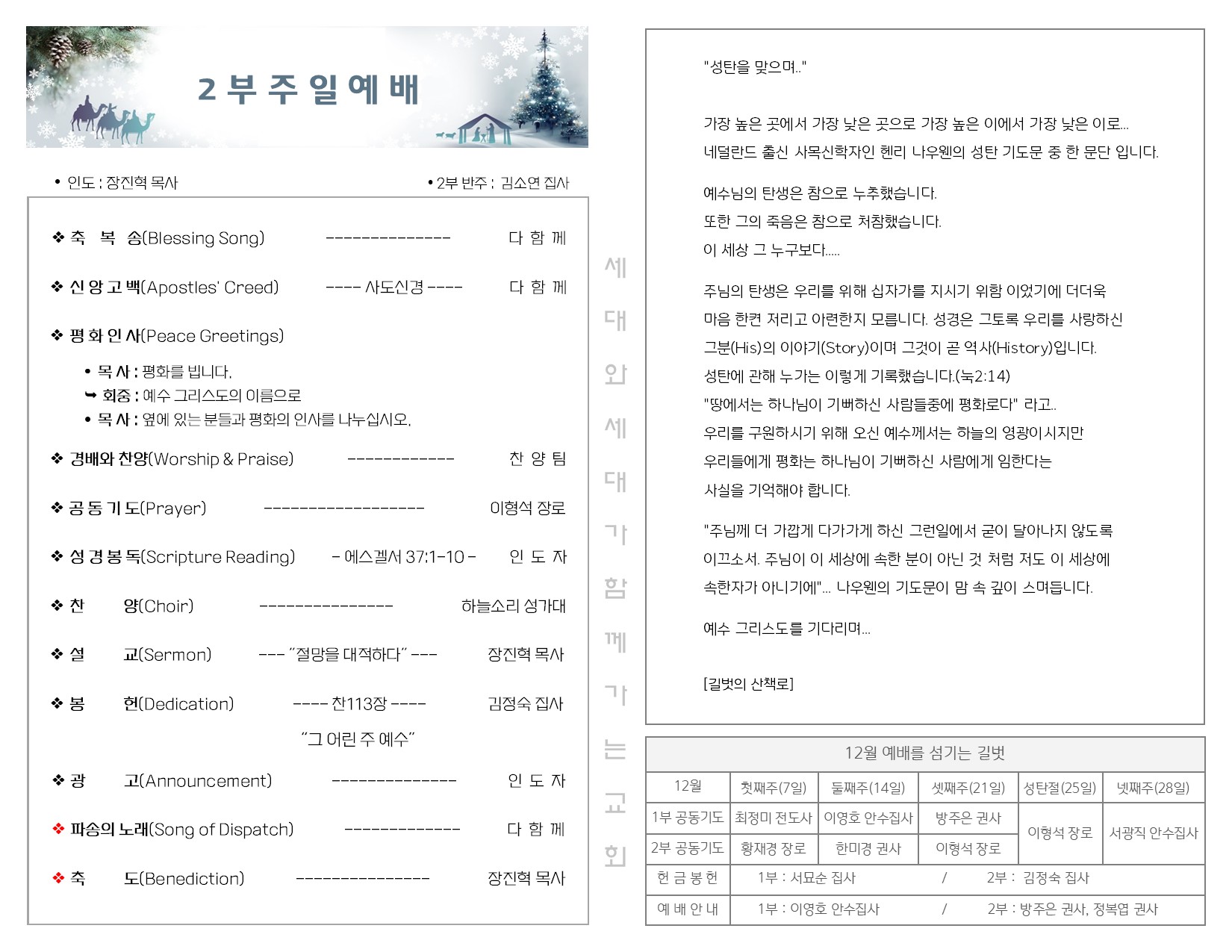 12월 21일 주일 예배 주보 Publish on December 24,2025 | 길벗교회 페이지 정보 작성자 길벗교회 댓글 0건 조회 33회 작성일 25-12-24 18:09 목록 본문 12월 21일 주일 예배 주보 다음글12월 14일 주일 예배 주보 25.12.17 댓글 0 댓글목록 등록된 댓글이 없습니다. 목록