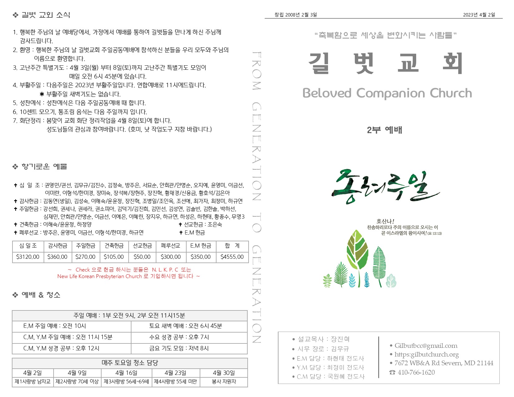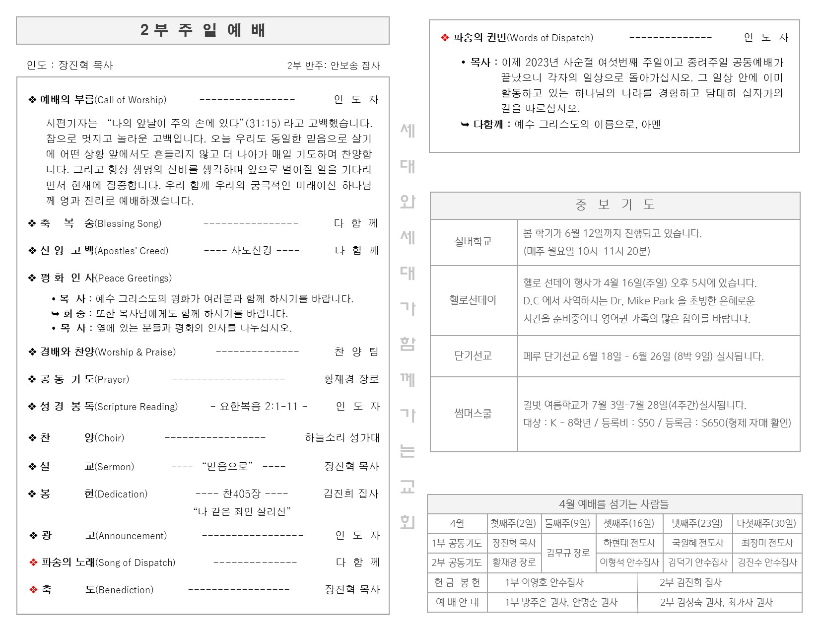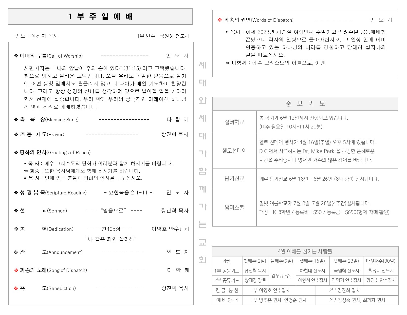 4월 2일 주일 예배 주보 Publish on April 04,2023 | 길벗교회 페이지 정보 작성자 길벗교회 댓글 0건 조회 1,958회 작성일 23-04-04 05:26 목록 본문 4월 2일 주일 예배 주보 이전글2023년 4월 9일 부활주일 예배 23.04.10 다음글3월 26일 주일 예배 주보 23.03.28 댓글 0 댓글목록 등록된 댓글이 없습니다. 목록