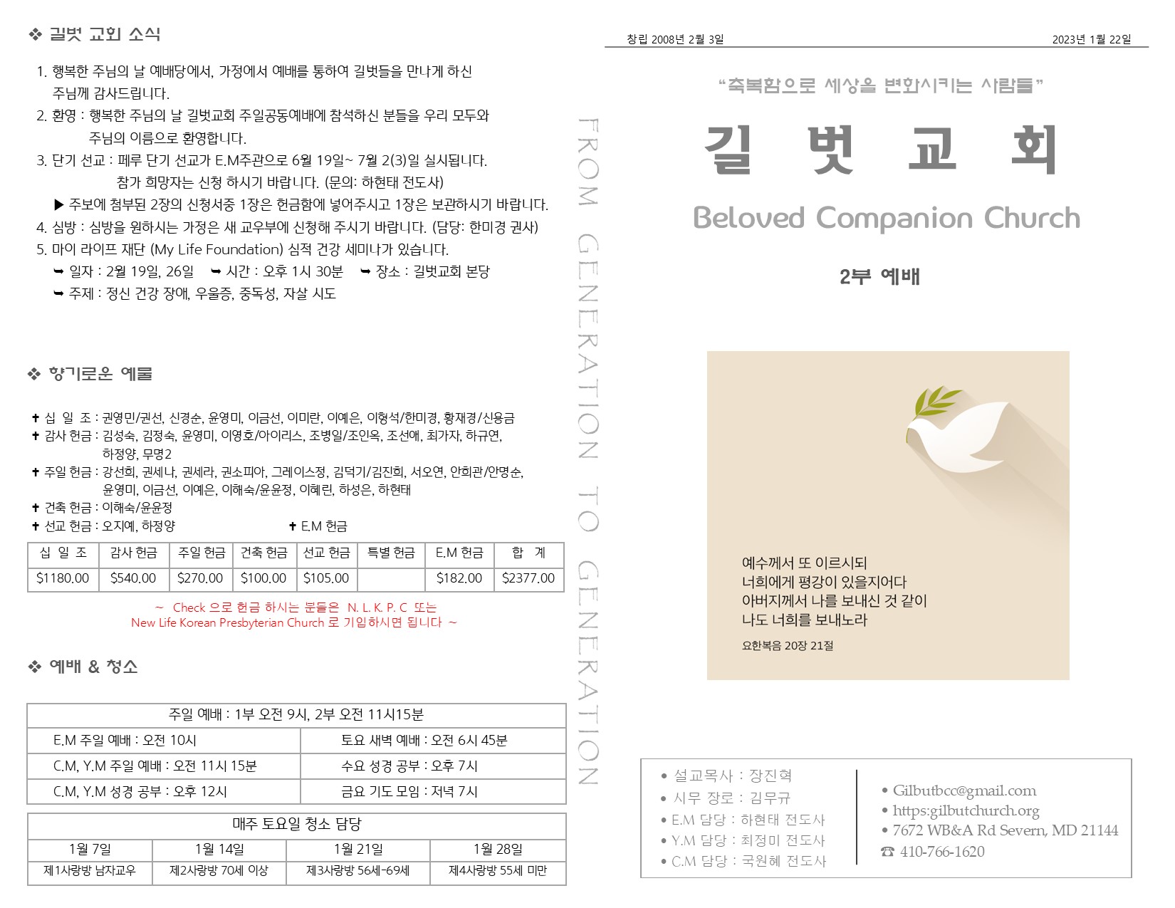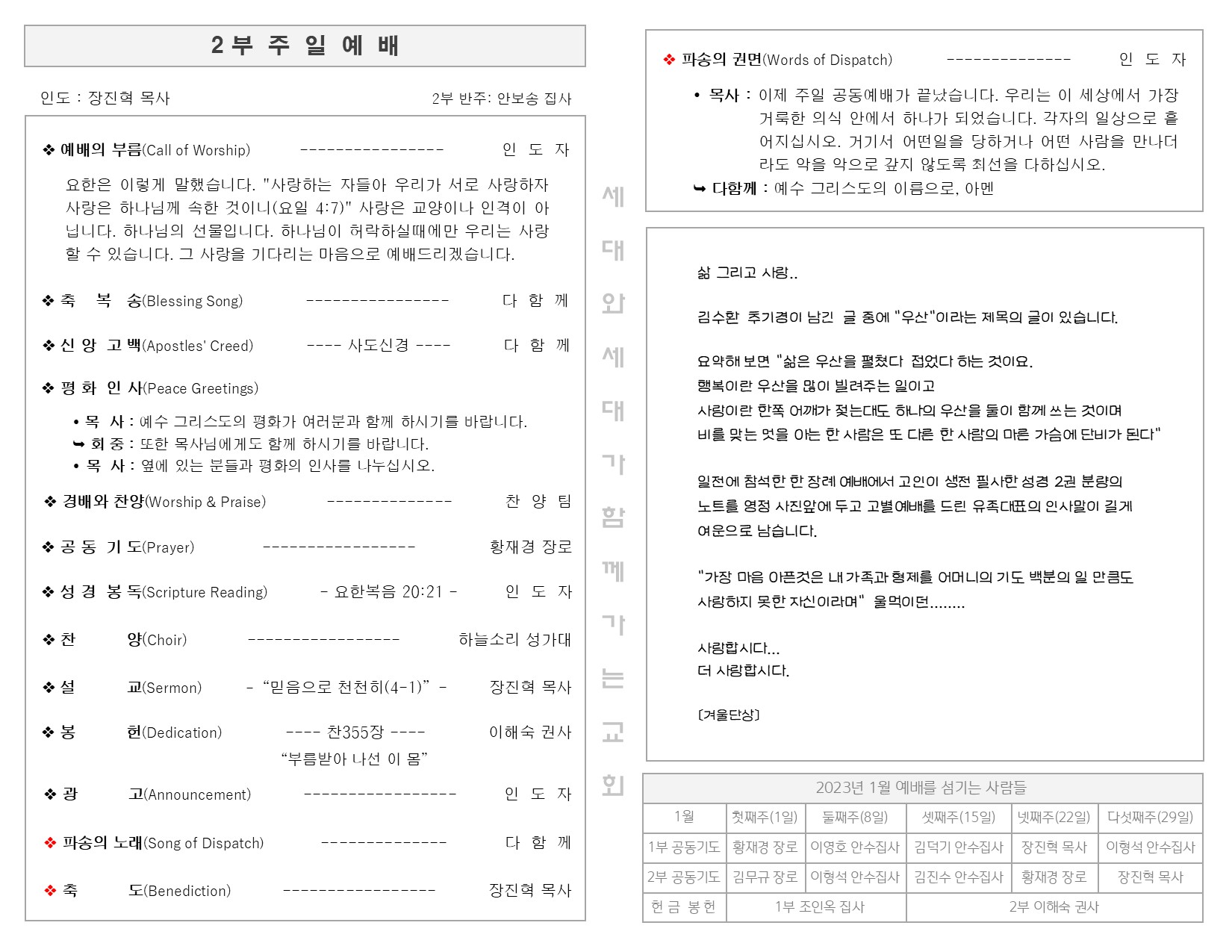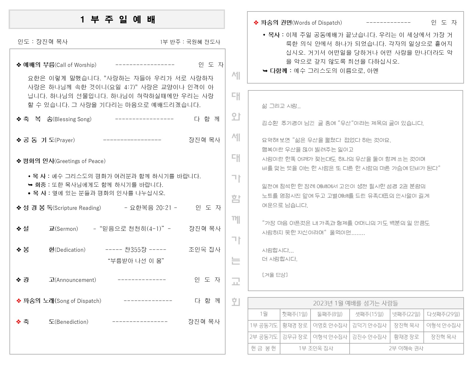1월 22일 주일 예배 주보 Publish on January 23,2023 | 길벗교회 페이지 정보 작성자 길벗교회 댓글 0건 조회 2,332회 작성일 23-01-23 08:37 목록 본문 1월 22일 주일 예배 주보 이전글1월 29일 주일 예배 주보 23.02.01 다음글1월 15일 주일 예배 주보 23.01.17 댓글 0 댓글목록 등록된 댓글이 없습니다. 목록