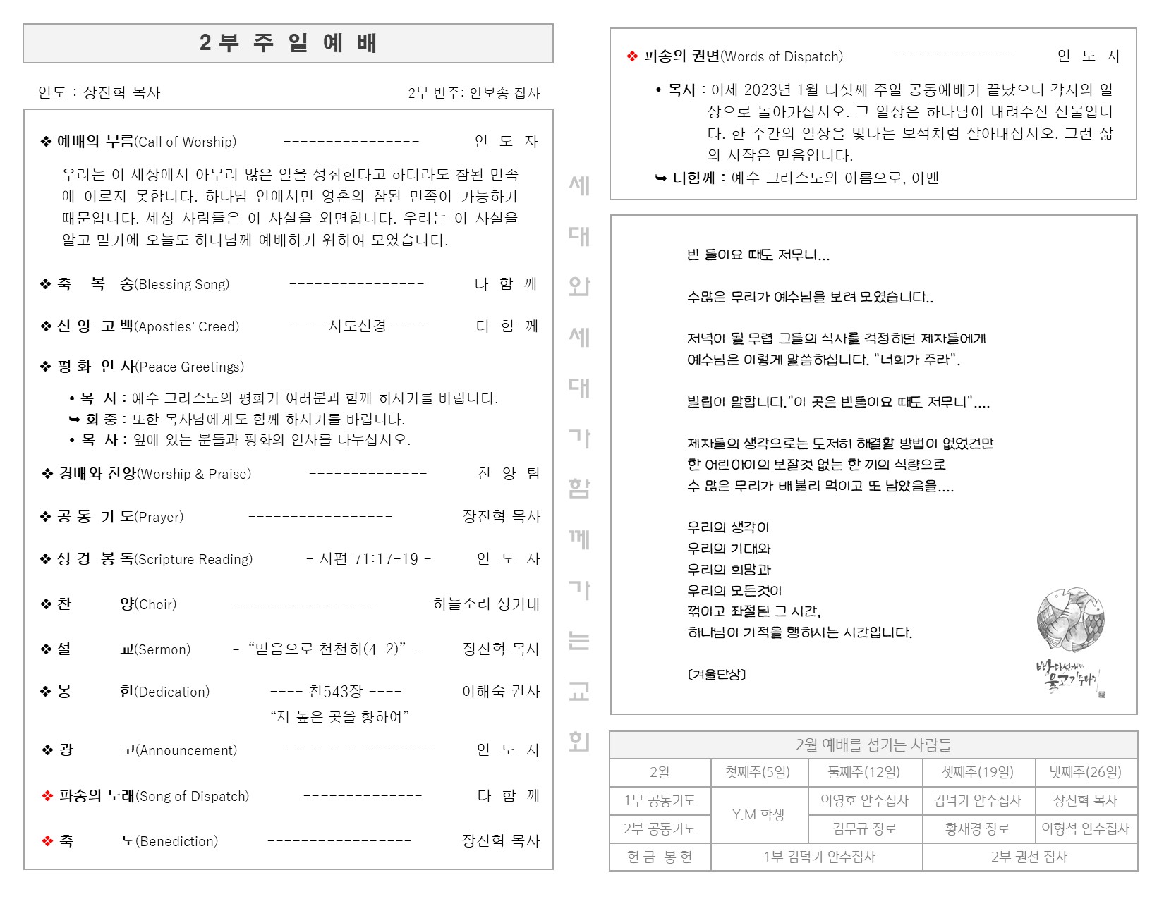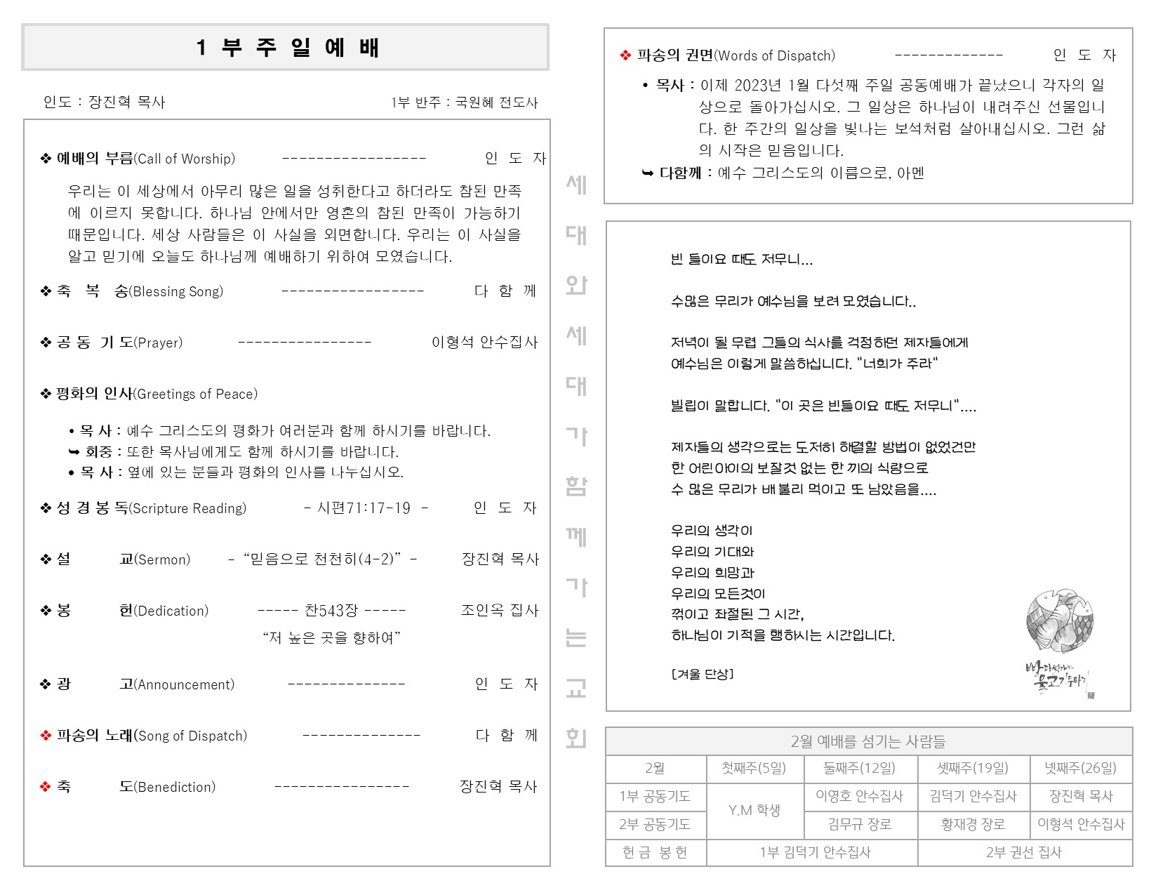 1월 29일 주일 예배 주보 Publish on February 01,2023 | 길벗교회 페이지 정보 작성자 길벗교회 댓글 0건 조회 2,357회 작성일 23-02-01 06:21 목록 본문 1월 29일 주일 예배 주보 이전글2월 5일 창립15주년 예배 주보 23.02.07 다음글1월 22일 주일 예배 주보 23.01.23 댓글 0 댓글목록 등록된 댓글이 없습니다. 목록