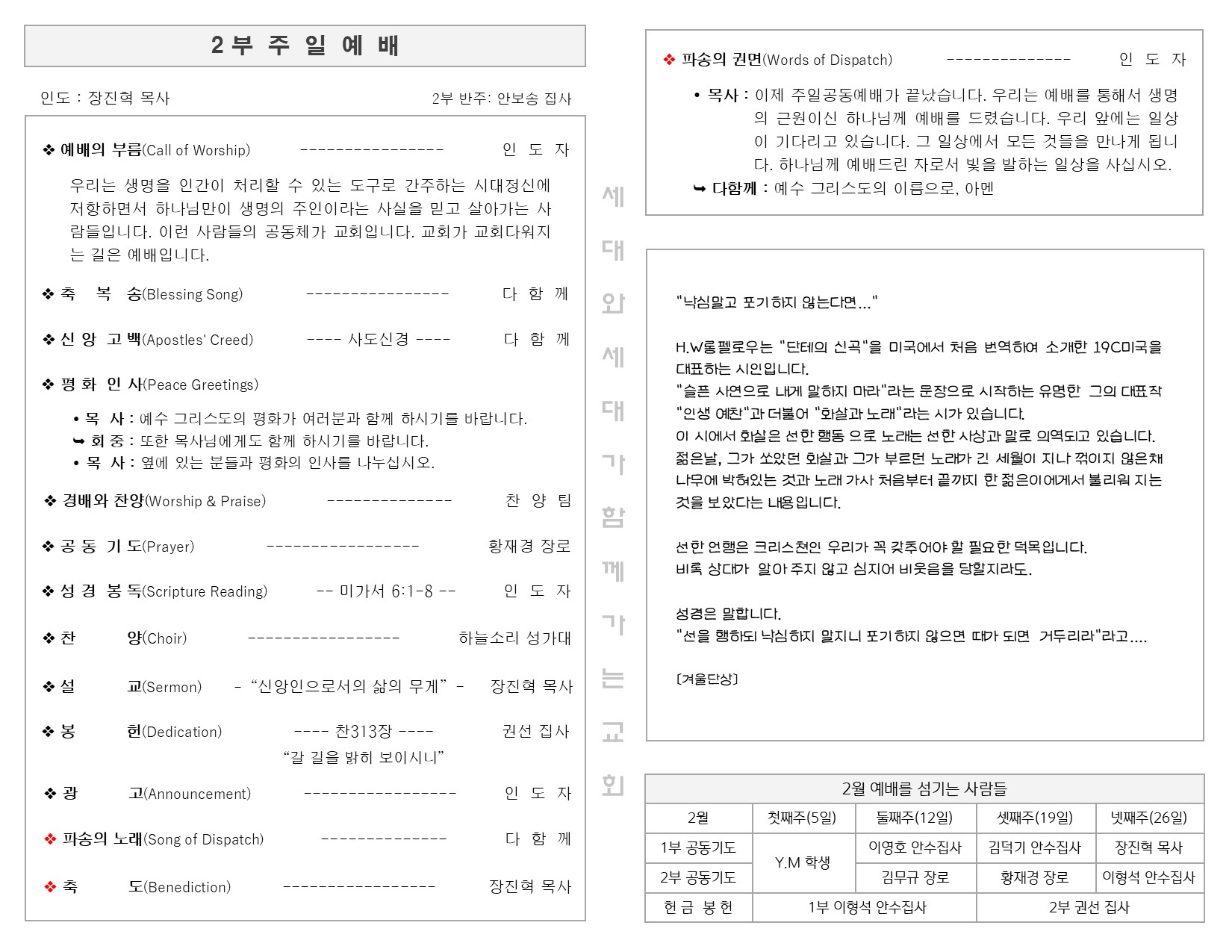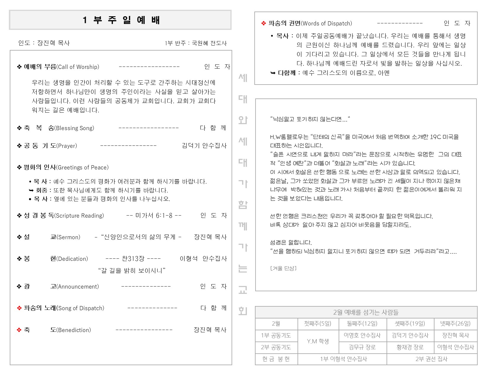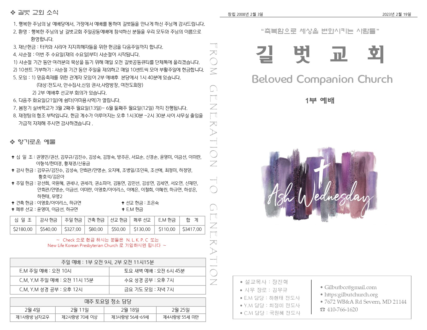 2월 19일 주일 예배 주보 Publish on February 20,2023 | 길벗교회 페이지 정보 작성자 길벗교회 댓글 0건 조회 2,342회 작성일 23-02-20 18:33 목록 본문 2월 19일 주일 예배 주보 이전글2월 26일 주일 예배 주보 23.02.28 다음글2월 12일 주일 예배 주보 23.02.13 댓글 0 댓글목록 등록된 댓글이 없습니다. 목록