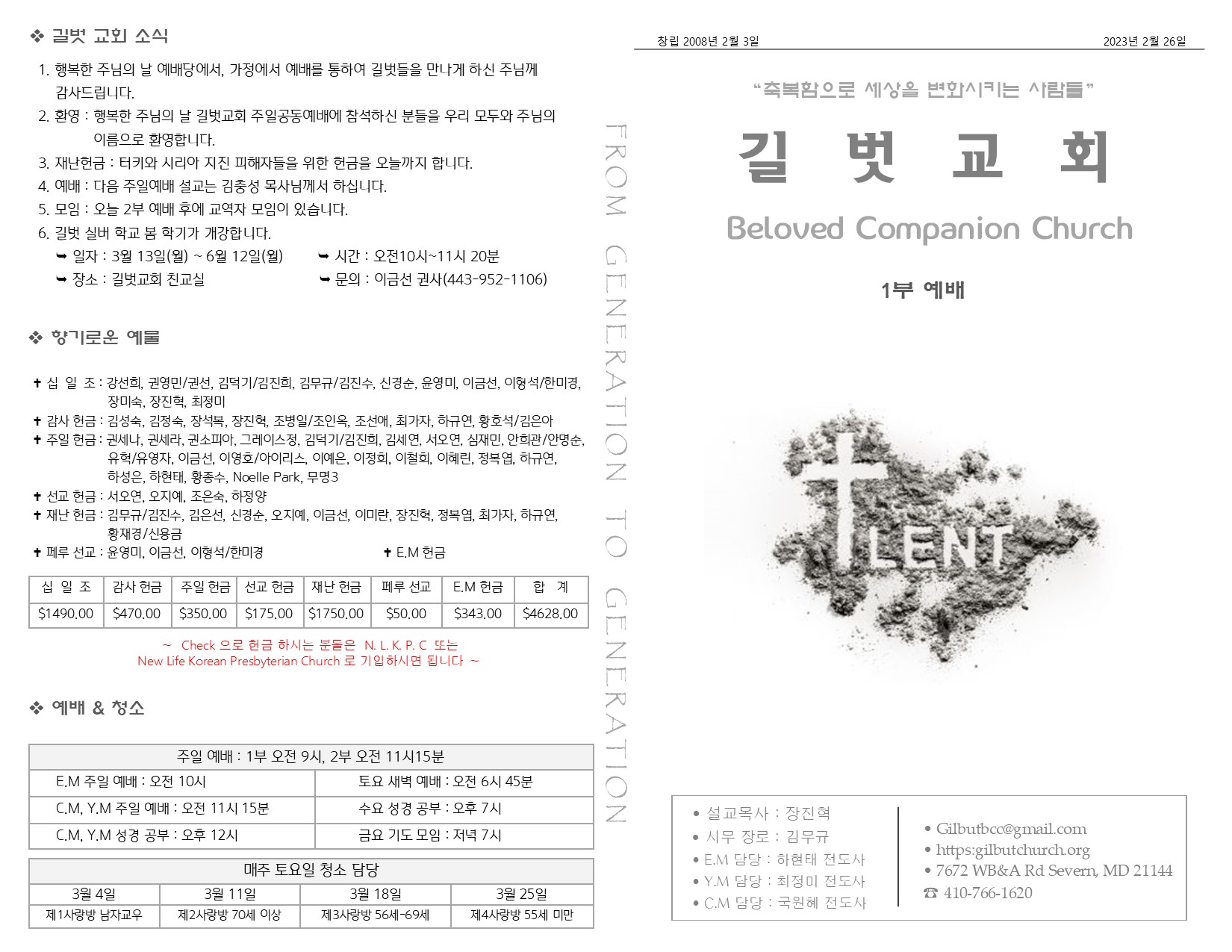 2월 26일 주일 예배 주보 Publish on February 28,2023 | 길벗교회 페이지 정보 작성자 길벗교회 댓글 0건 조회 1,977회 작성일 23-02-28 05:10 목록 본문 2월 26일 주일 예배 주보 이전글3월 5일 주일 예배 주보 23.03.06 다음글2월 19일 주일 예배 주보 23.02.20 댓글 0 댓글목록 등록된 댓글이 없습니다. 목록