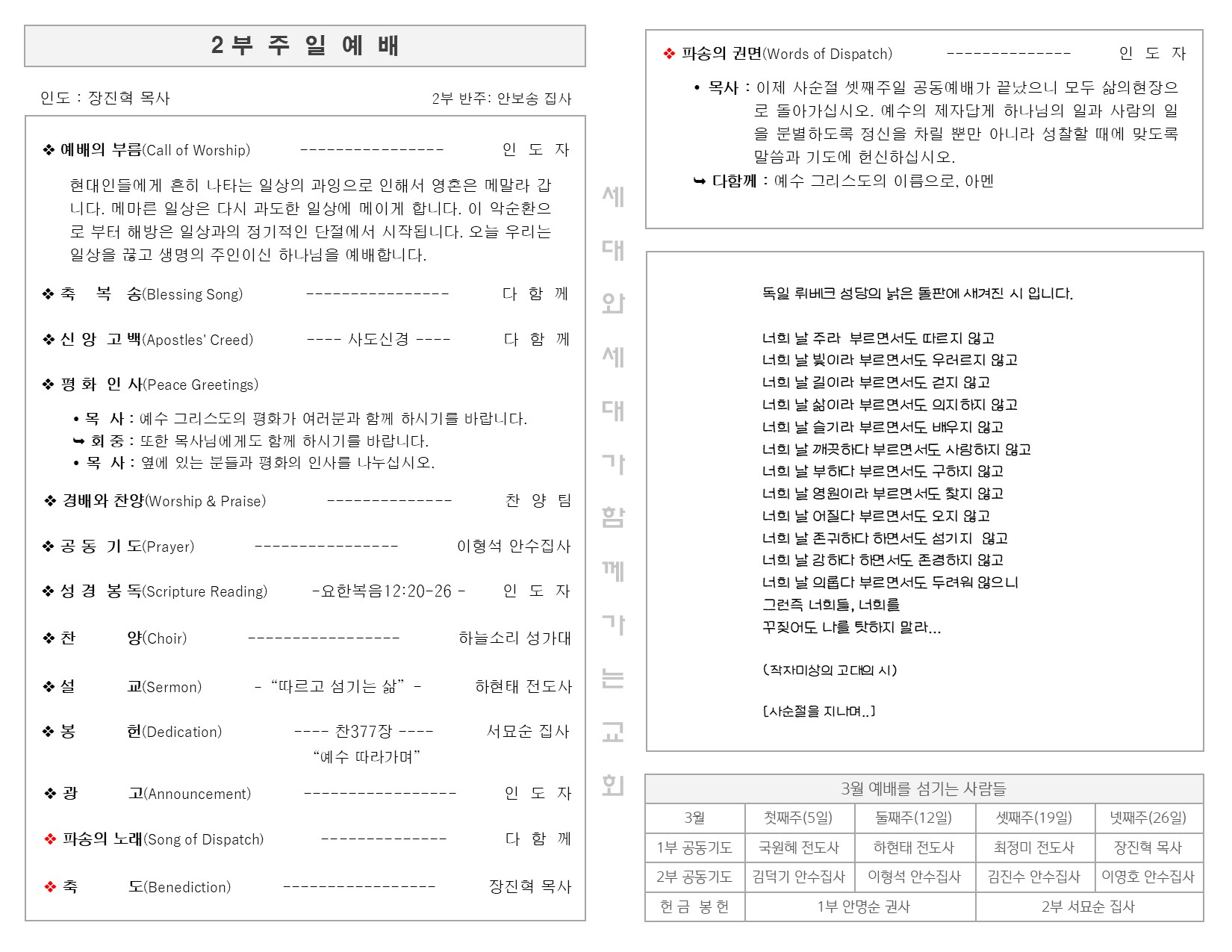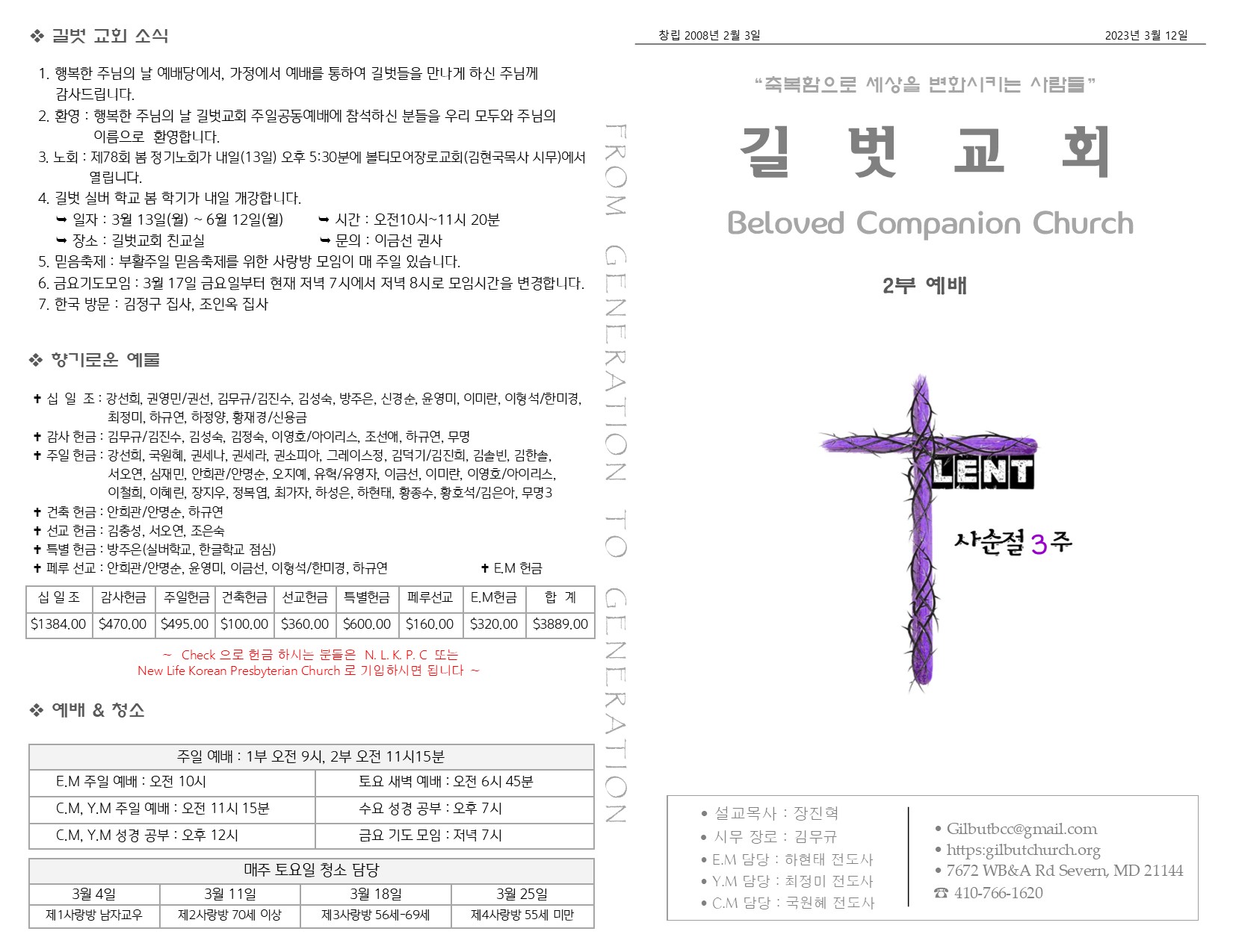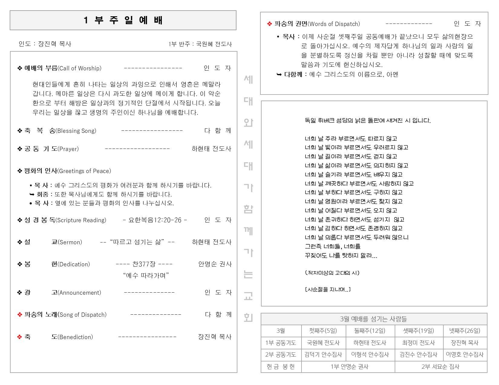 3월 12일 주일 예배 주보 Publish on March 14,2023 | 길벗교회 페이지 정보 작성자 길벗교회 댓글 0건 조회 2,326회 작성일 23-03-14 06:24 목록 본문 3월 12일 주일 예배 주보 이전글3월 19일 주일 예배 주보 23.03.20 다음글3월 5일 주일 예배 주보 23.03.06 댓글 0 댓글목록 등록된 댓글이 없습니다. 목록