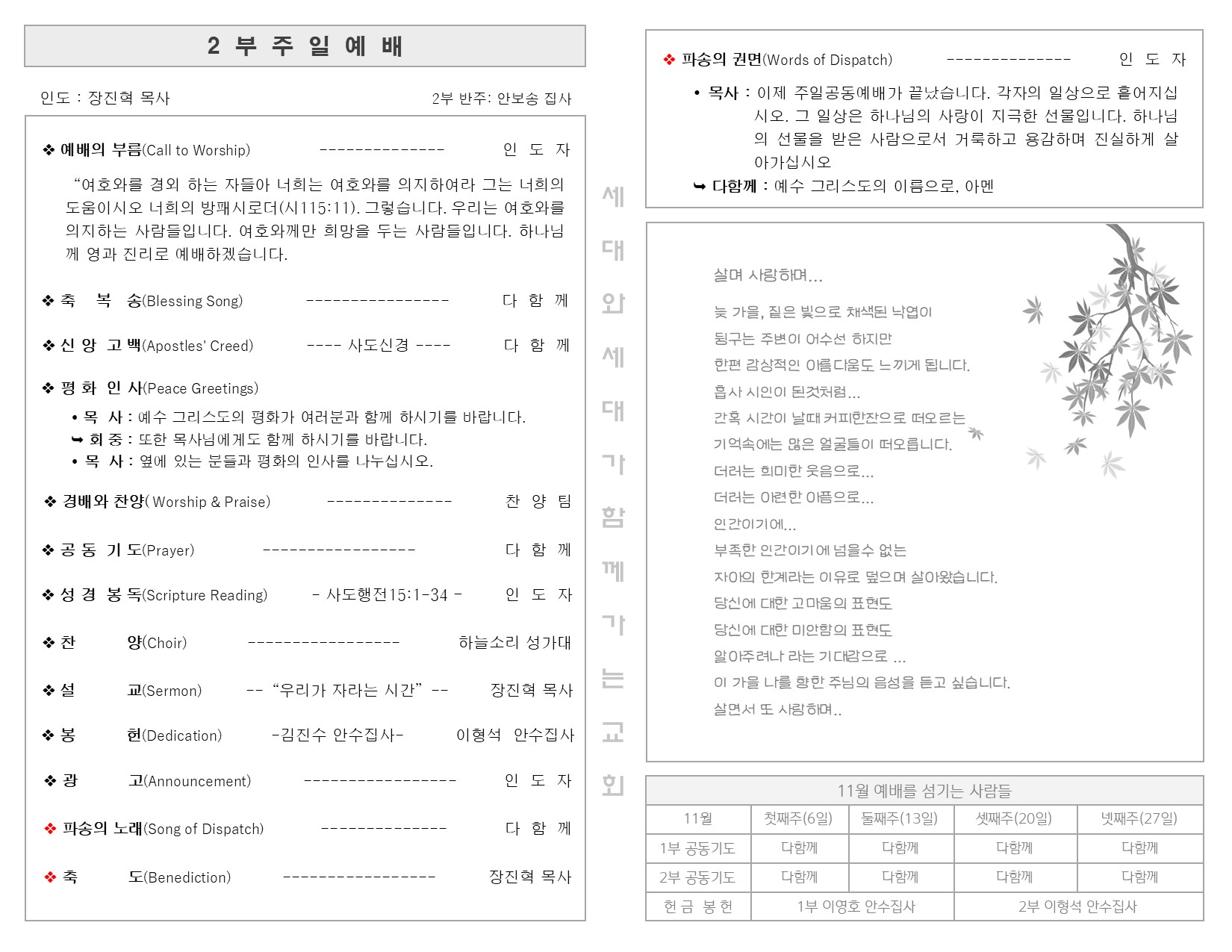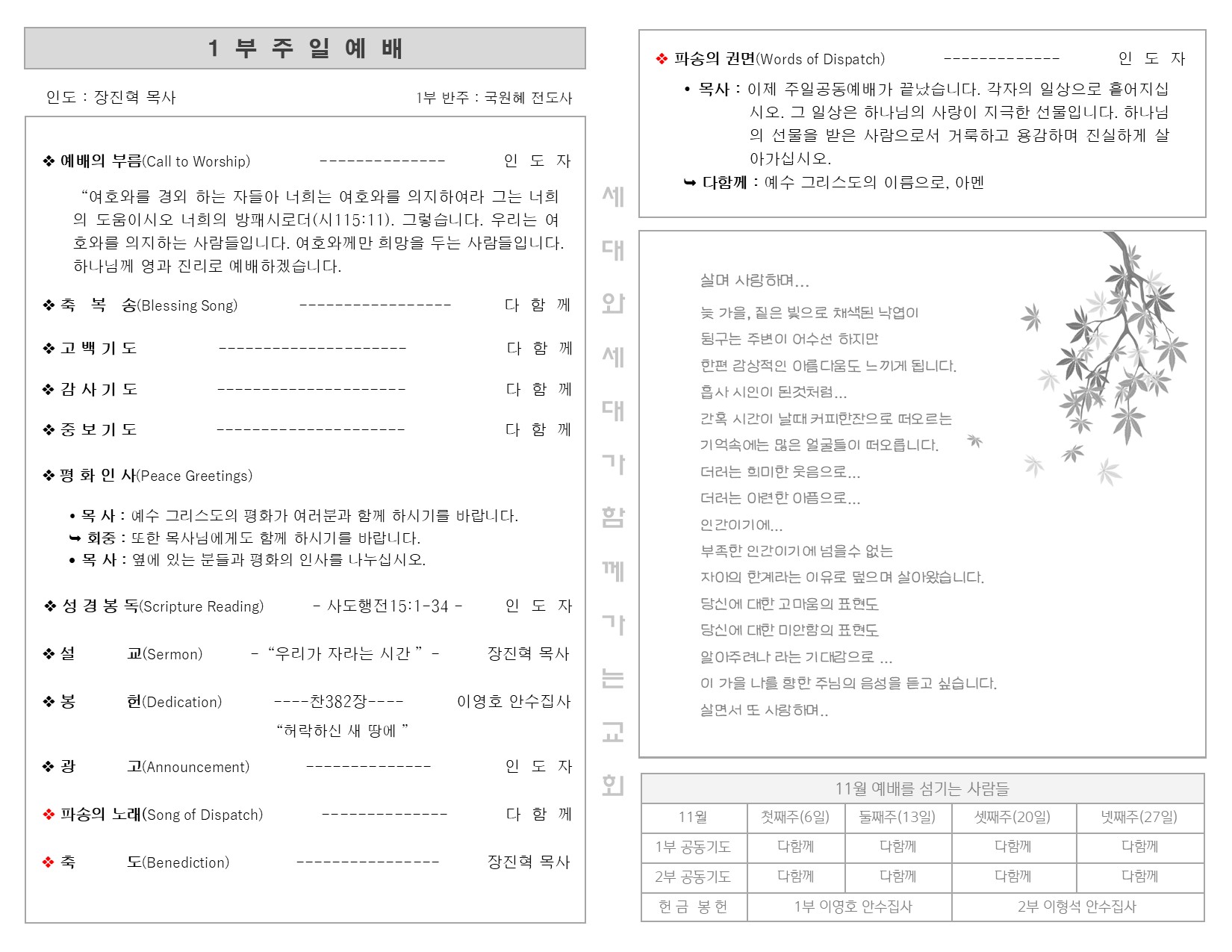 11월 6일 주일예배 주보 Publish on November 10,2022 | 길벗교회 페이지 정보 작성자 길벗교회 댓글 0건 조회 2,123회 작성일 22-11-10 04:33 목록 본문 11월 6일 주일예배 주보 이전글11월 13일 주일예배 주보 22.11.15 다음글10월 30일 주일예배 주보 22.11.02 댓글 0 댓글목록 등록된 댓글이 없습니다. 목록
