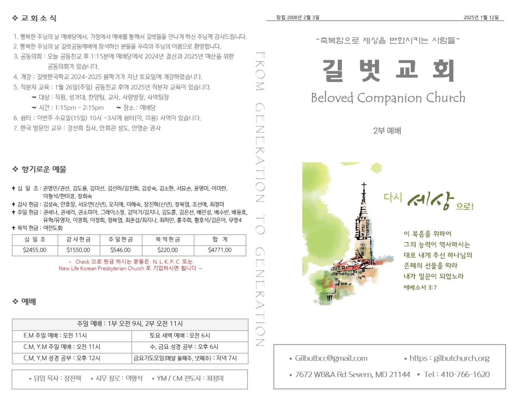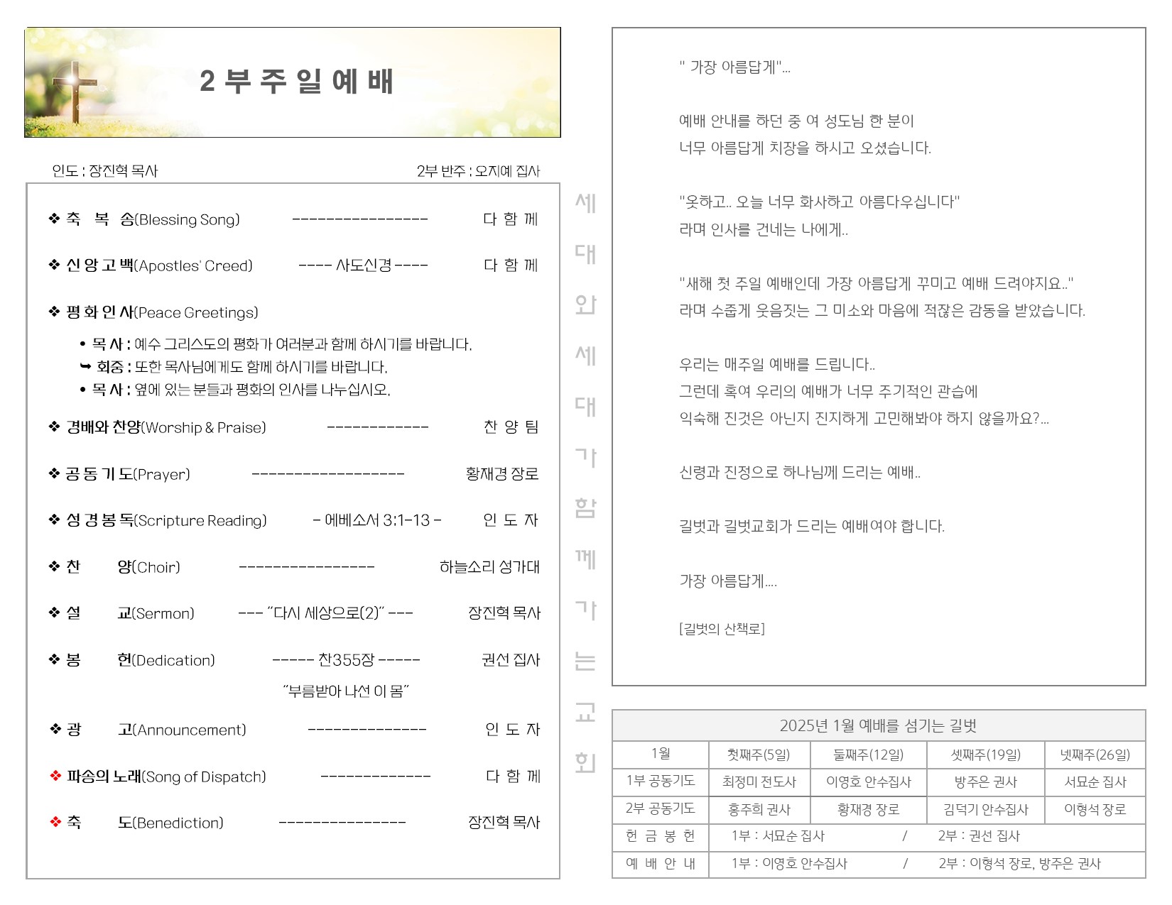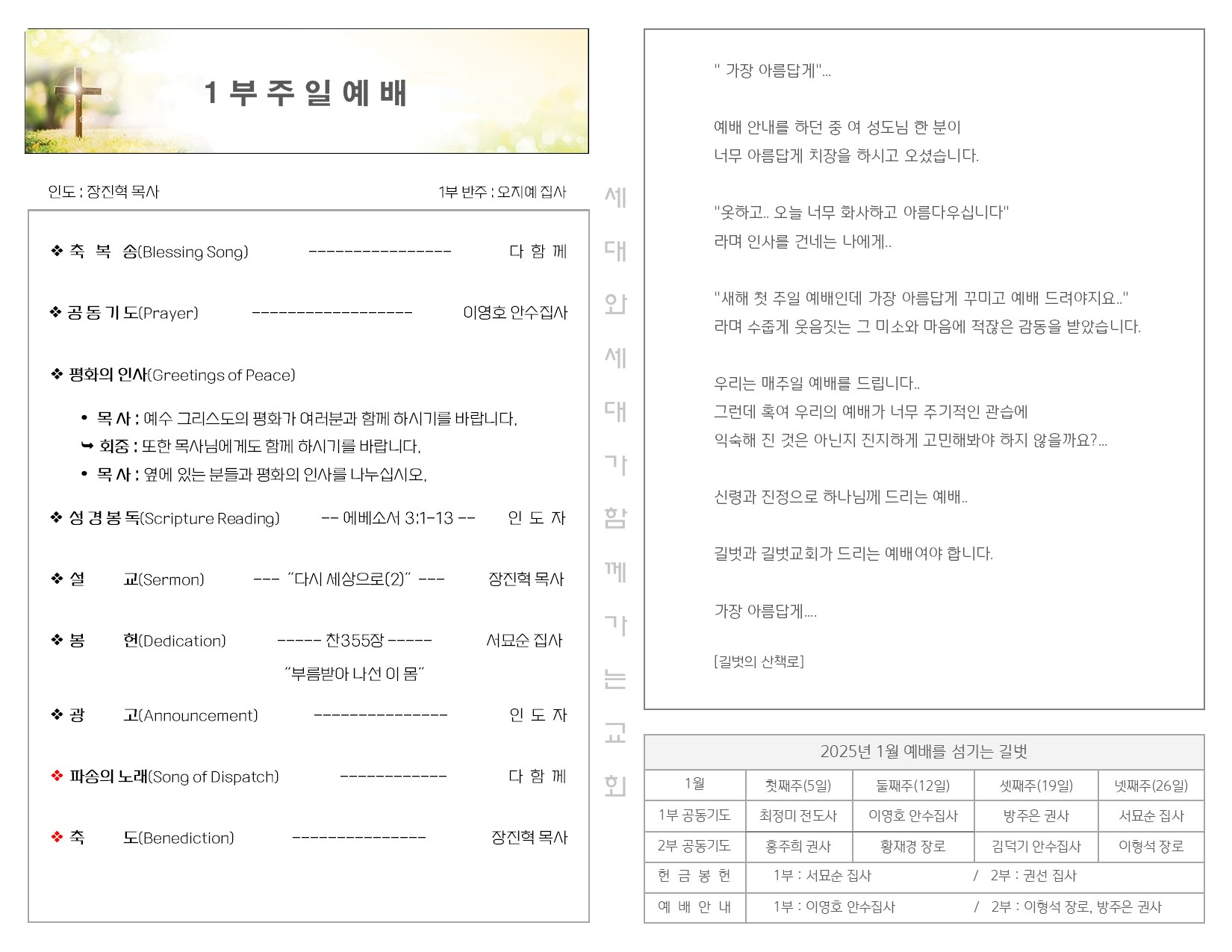 1월 12일 주일 예배 주보 Publish on January 15,2025 | 길벗교회 페이지 정보 작성자 길벗교회 댓글 0건 조회 1,396회 작성일 25-01-15 04:48 목록 본문 1월 12일 주일 예배 주보 이전글1월 19일 주일 예배 주보 25.01.22 다음글2025년 1월 5일 주일 예배 주보 25.01.07 댓글 0 댓글목록 등록된 댓글이 없습니다. 목록