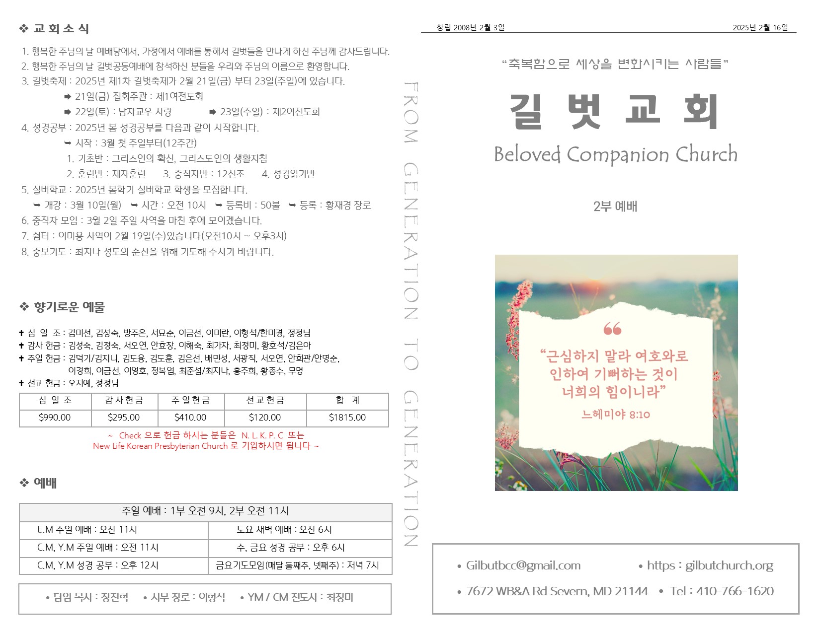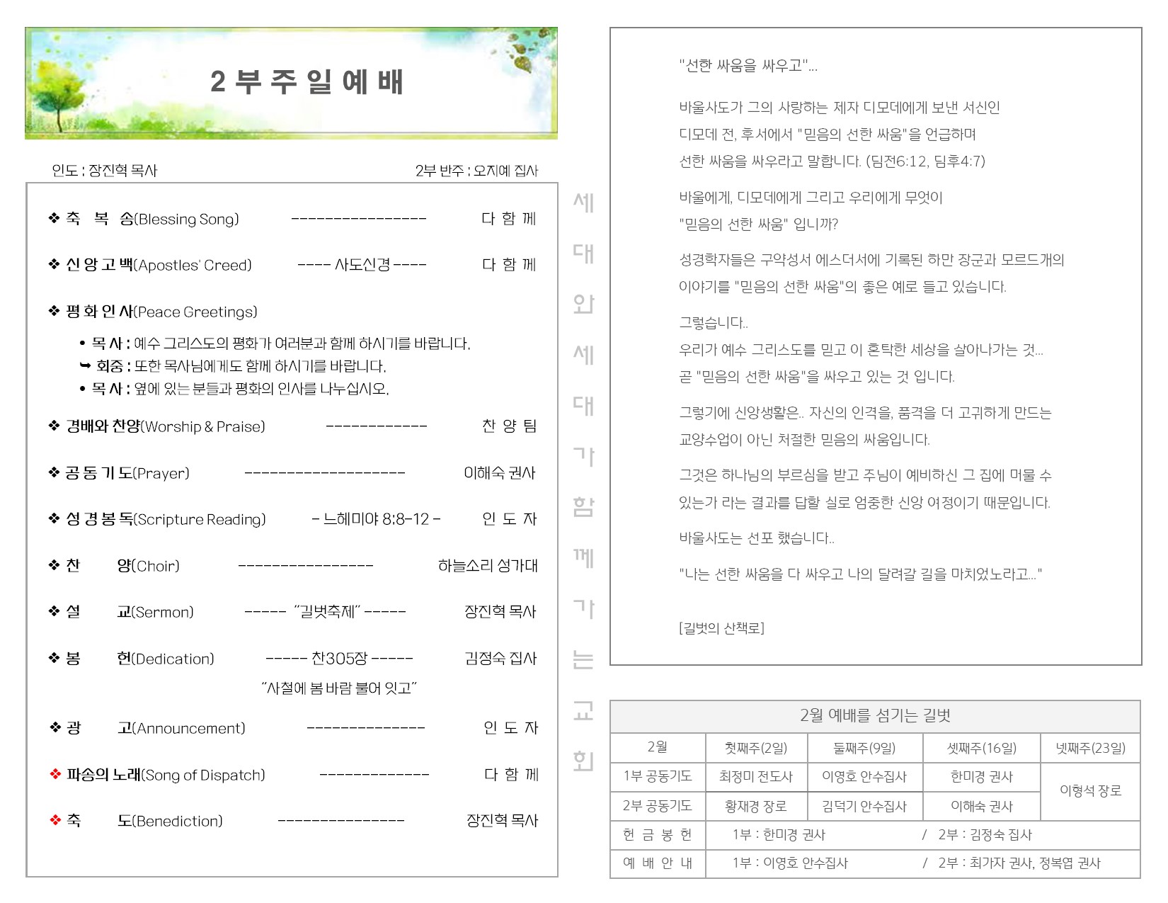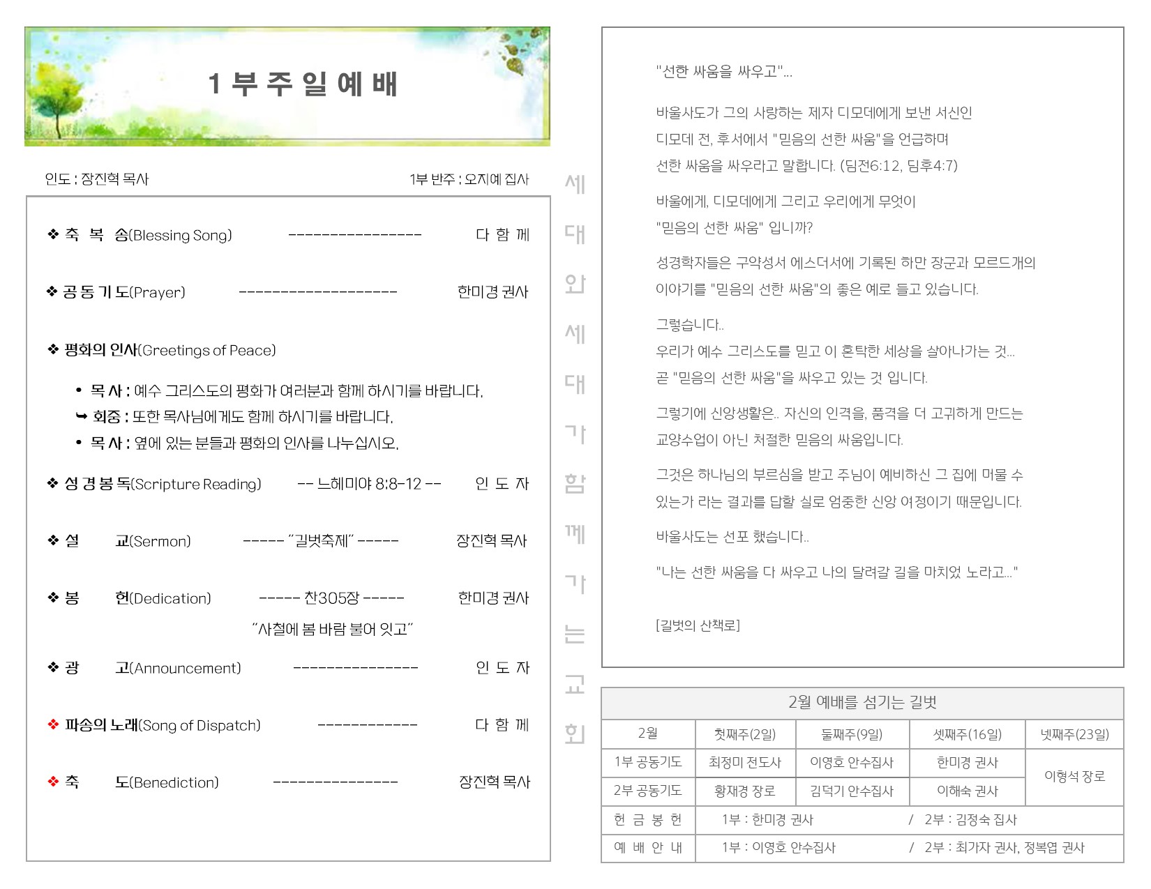 2월 16일 주일 예배 주보 Publish on February 19,2025 | 길벗교회 페이지 정보 작성자 길벗교회 댓글 0건 조회 1,439회 작성일 25-02-19 05:23 목록 본문 2월 16일 주일 예배 주보 이전글2월 21-23일 제1차 길벗축제 주보 25.02.26 다음글2월 9일 주일 예배 주보 25.02.12 댓글 0 댓글목록 등록된 댓글이 없습니다. 목록