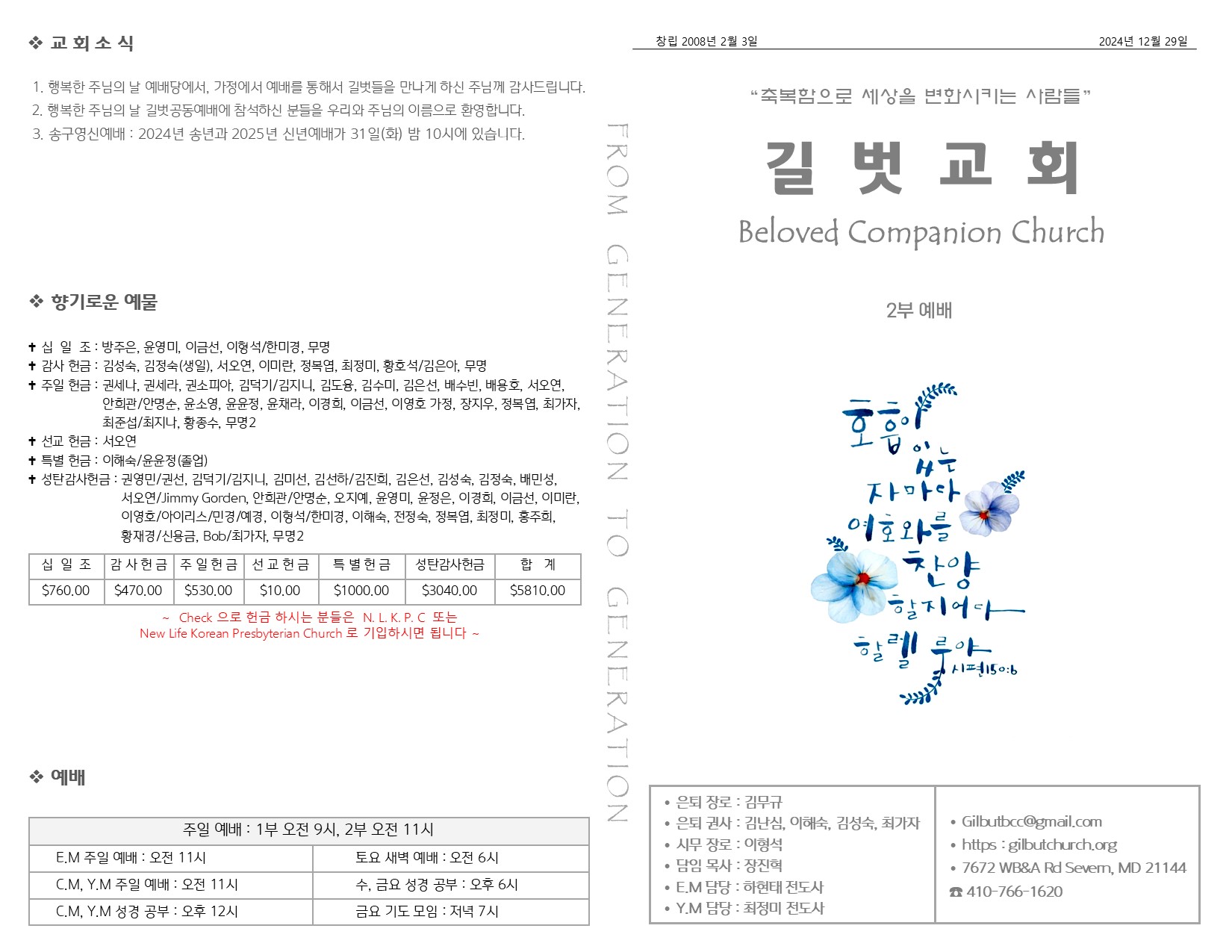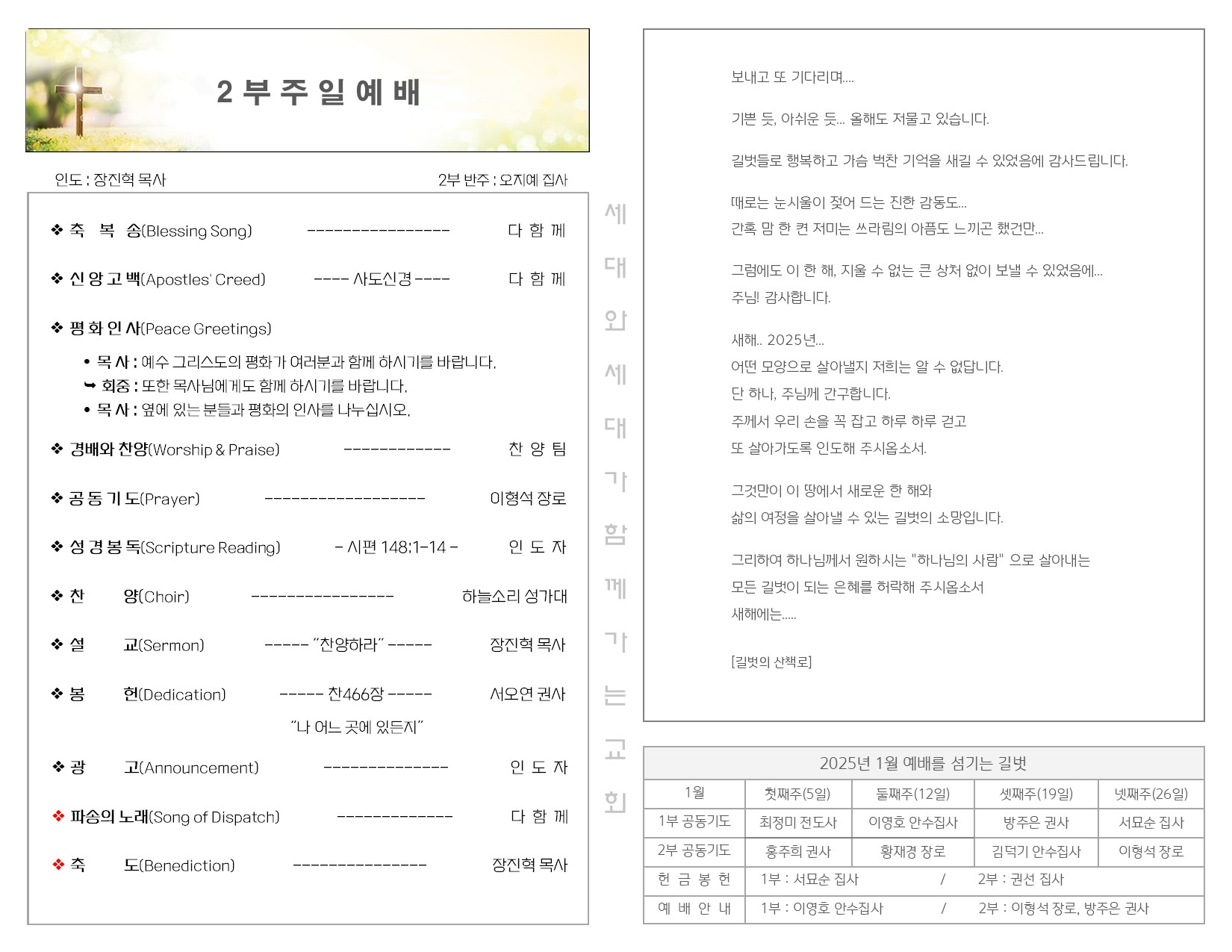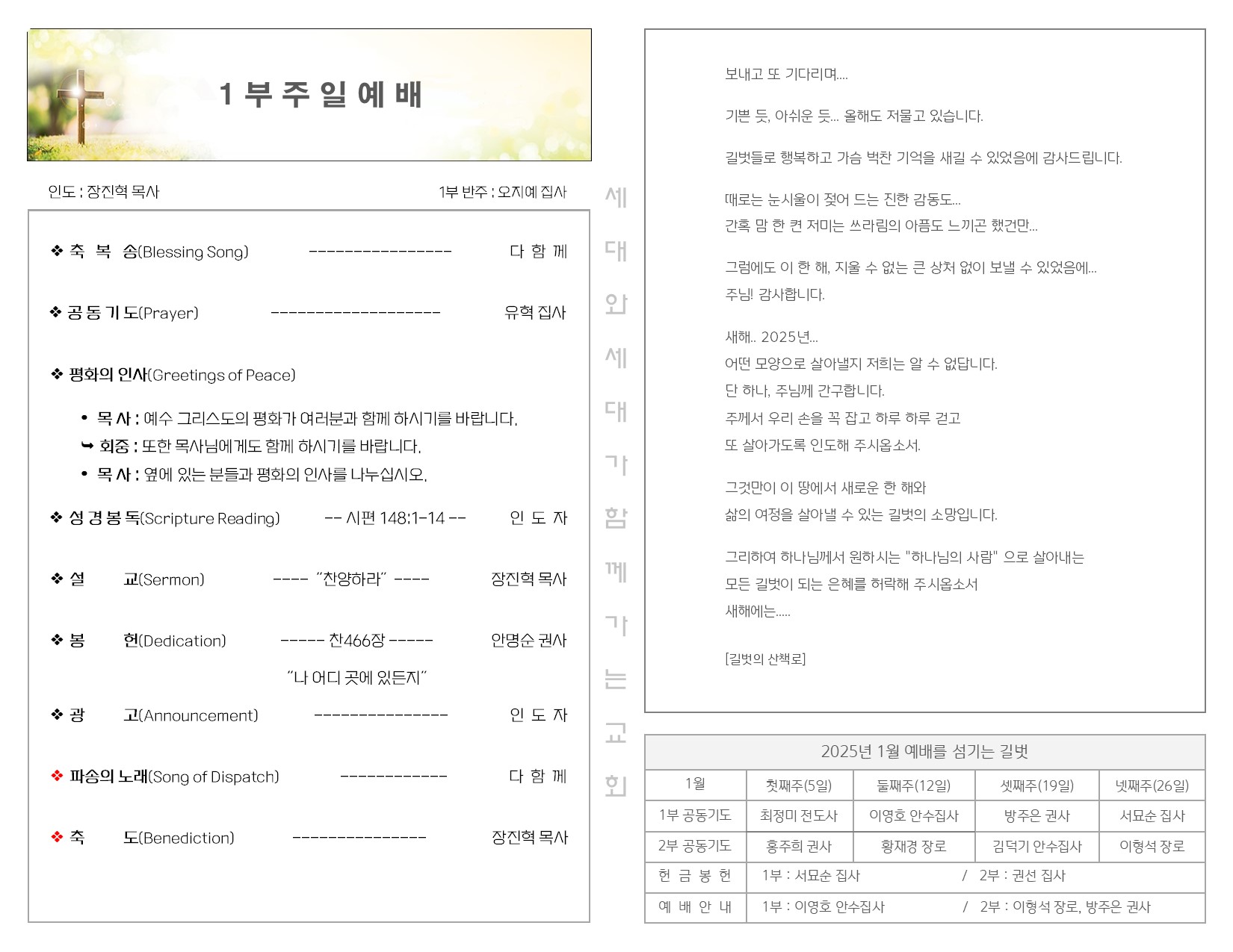 12월 29일 주일 예배 주보 Publish on December 31,2024 | 길벗교회 페이지 정보 작성자 길벗교회 댓글 0건 조회 1,423회 작성일 24-12-31 05:30 목록 본문 12월 29일 주일 예배 주보 이전글2025년 1월 5일 주일 예배 주보 25.01.07 다음글2024년 12월 25일 성탄 주일 주보 24.12.31 댓글 0 댓글목록 등록된 댓글이 없습니다. 목록