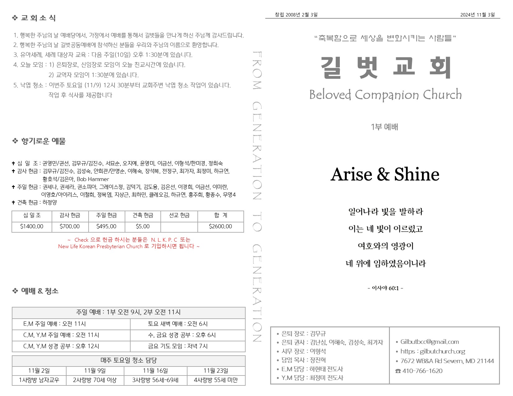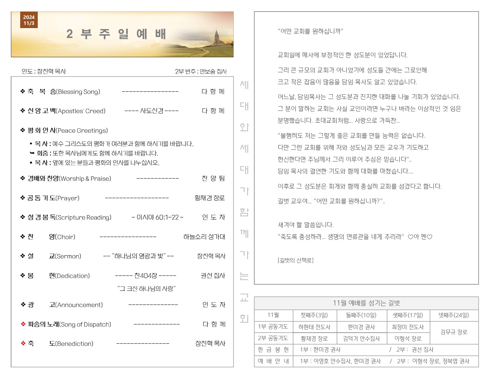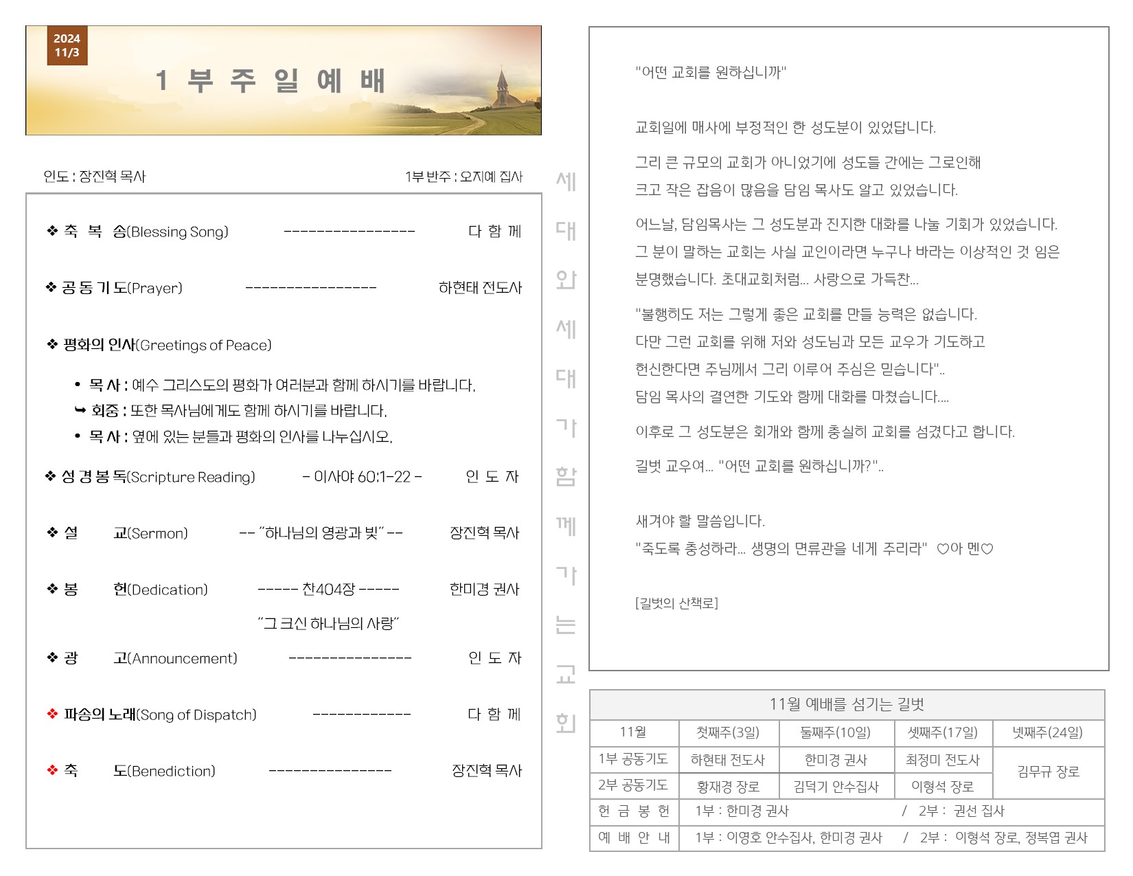 11월 3일 주일 예배 주보 Publish on November 06,2024 | 길벗교회 페이지 정보 작성자 길벗교회 댓글 0건 조회 1,173회 작성일 24-11-06 05:18 목록 본문 11월 3일 주일 예배 주보 이전글11월 10일 주일 예배 주보 24.11.12 다음글10월 27일 주일 예배 주보 24.10.29 댓글 0 댓글목록 등록된 댓글이 없습니다. 목록