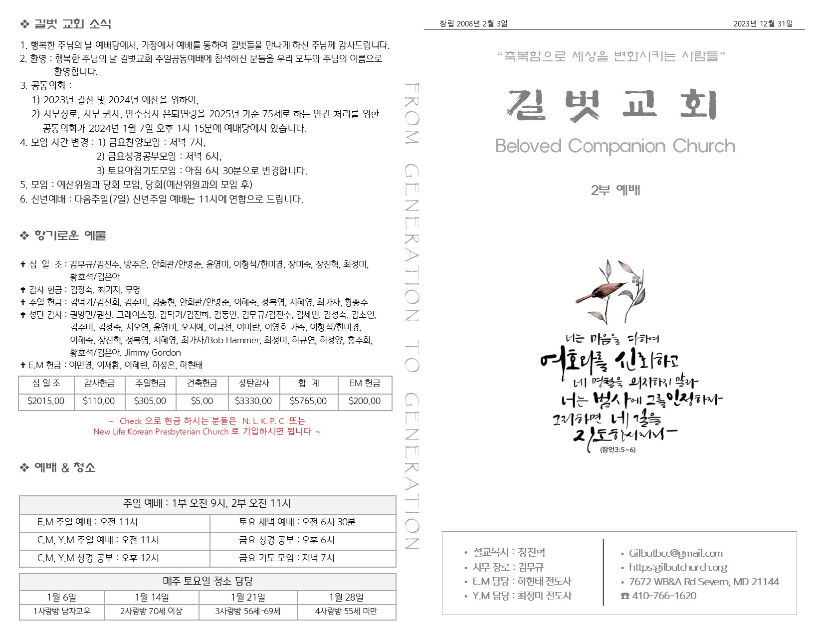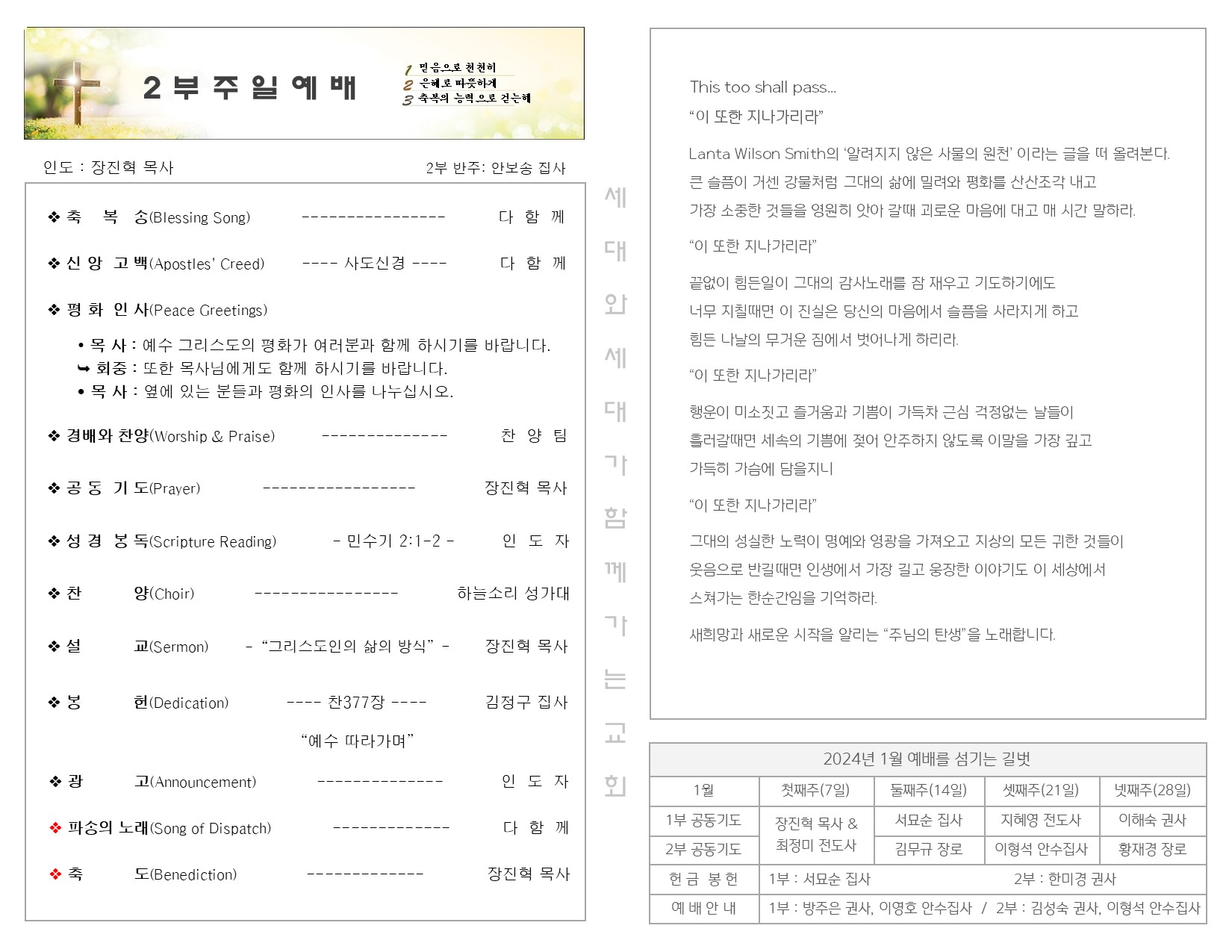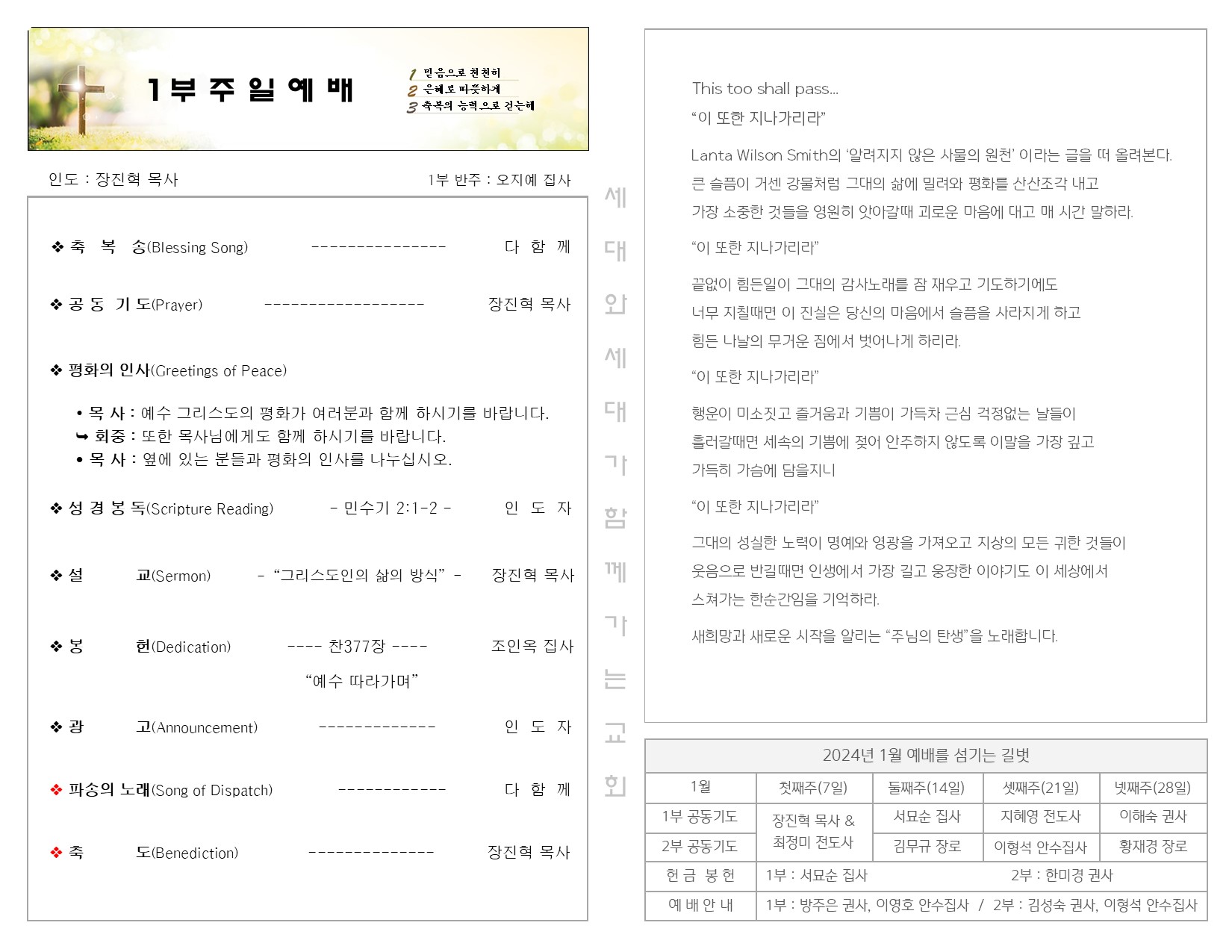 12월 31일 주일 예배 주보 Publish on January 02,2024 | 길벗교회 페이지 정보 작성자 길벗교회 댓글 0건 조회 2,175회 작성일 24-01-02 07:00 목록 본문 12월 31일 주일 예배 주보 이전글2024년 1월 7일 주일 예배 주보 24.01.09 다음글12월 24일 성탄 주일 예배 주보 23.12.26 댓글 0 댓글목록 등록된 댓글이 없습니다. 목록