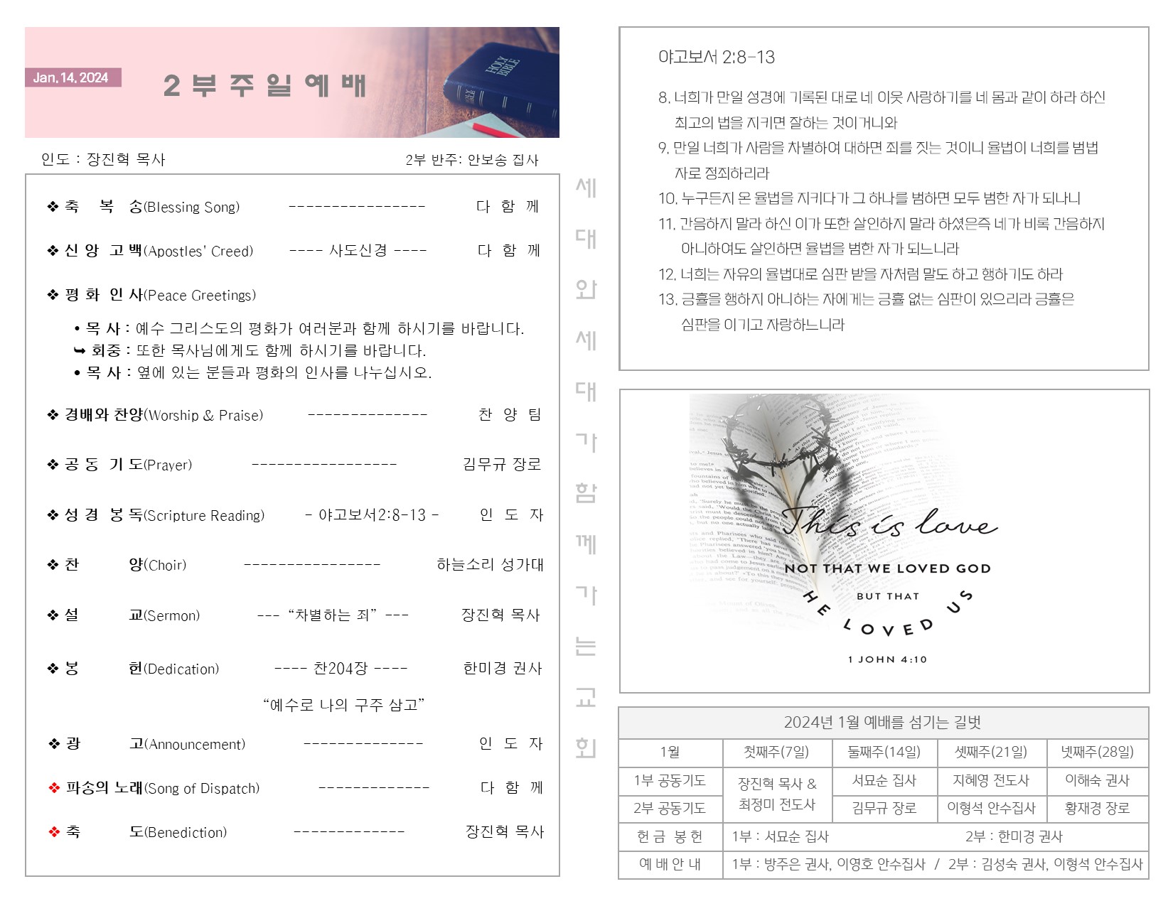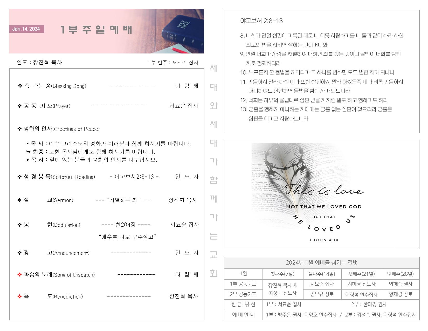 1월 14일 주일 예배 주보 Publish on January 16,2024 | 길벗교회 페이지 정보 작성자 길벗교회 댓글 0건 조회 1,802회 작성일 24-01-16 06:08 목록 본문 1월 14일 주일 예배 주보 이전글1월 21일 주일 예배 주보 24.01.23 다음글2024년 1월 7일 주일 예배 주보 24.01.09 댓글 0 댓글목록 등록된 댓글이 없습니다. 목록