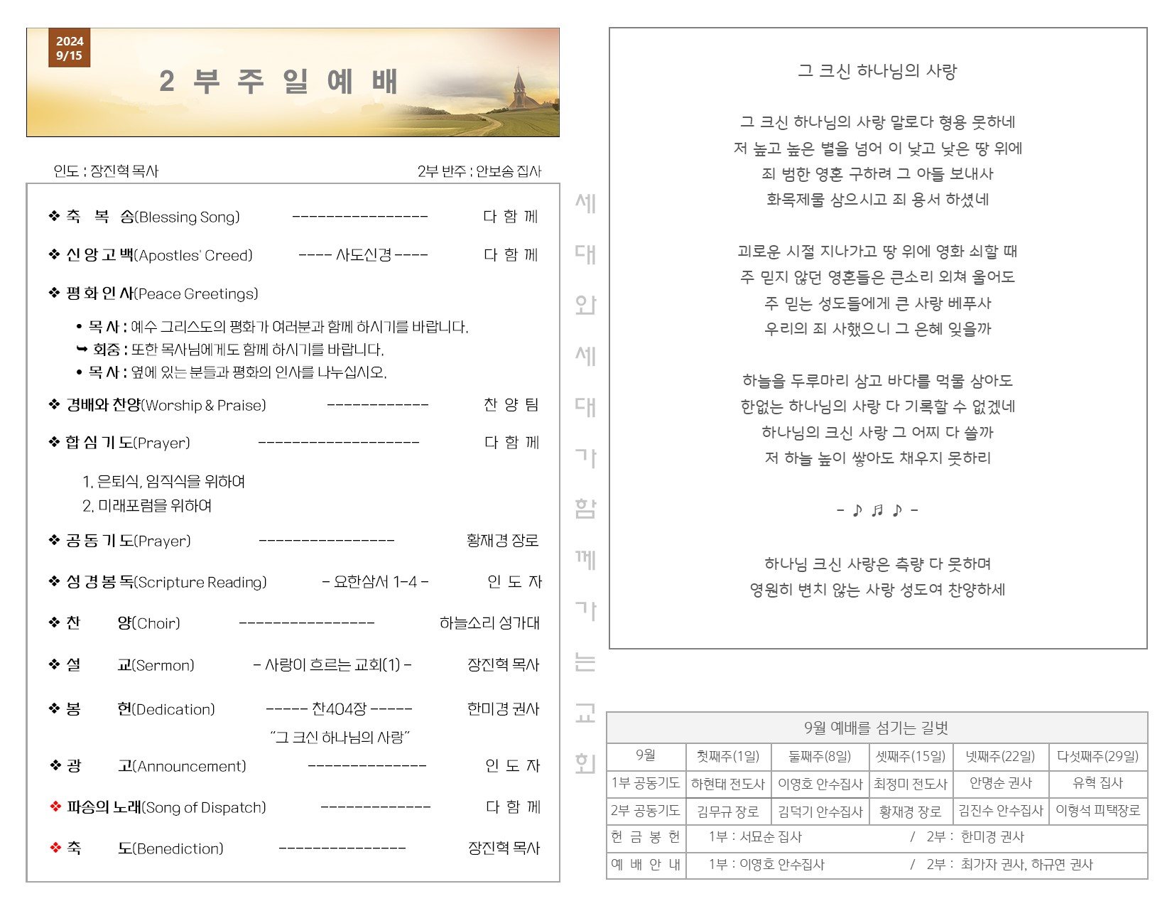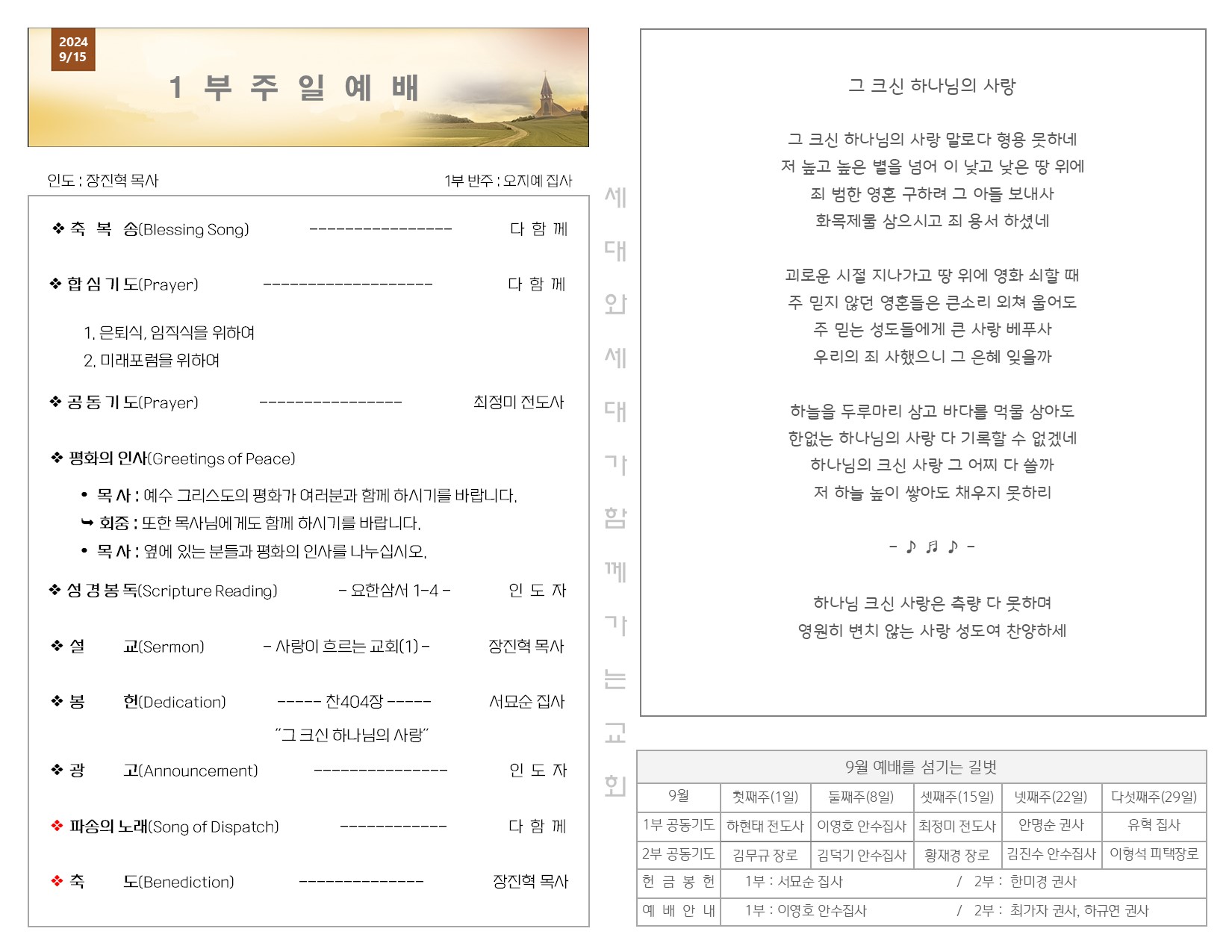 9월 15일 주일 예배 주보 Publish on September 17,2024 | 길벗교회 페이지 정보 작성자 길벗교회 댓글 0건 조회 1,466회 작성일 24-09-17 05:42 목록 본문 9월 15일 주일 예배 주보 이전글9월 22일 주일 예배 주보 24.09.24 다음글9월 8일 주일 예배 주보 24.09.10 댓글 0 댓글목록 등록된 댓글이 없습니다. 목록