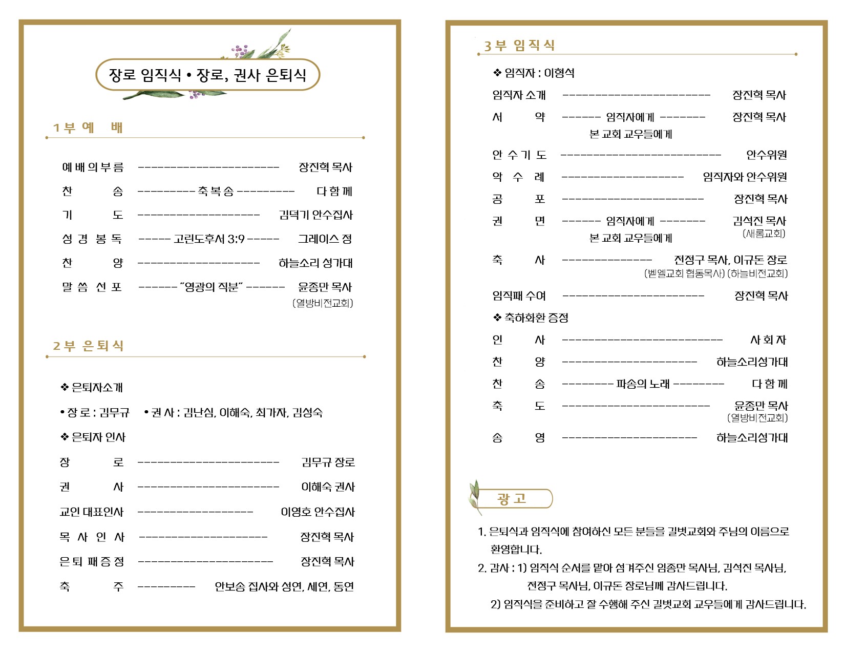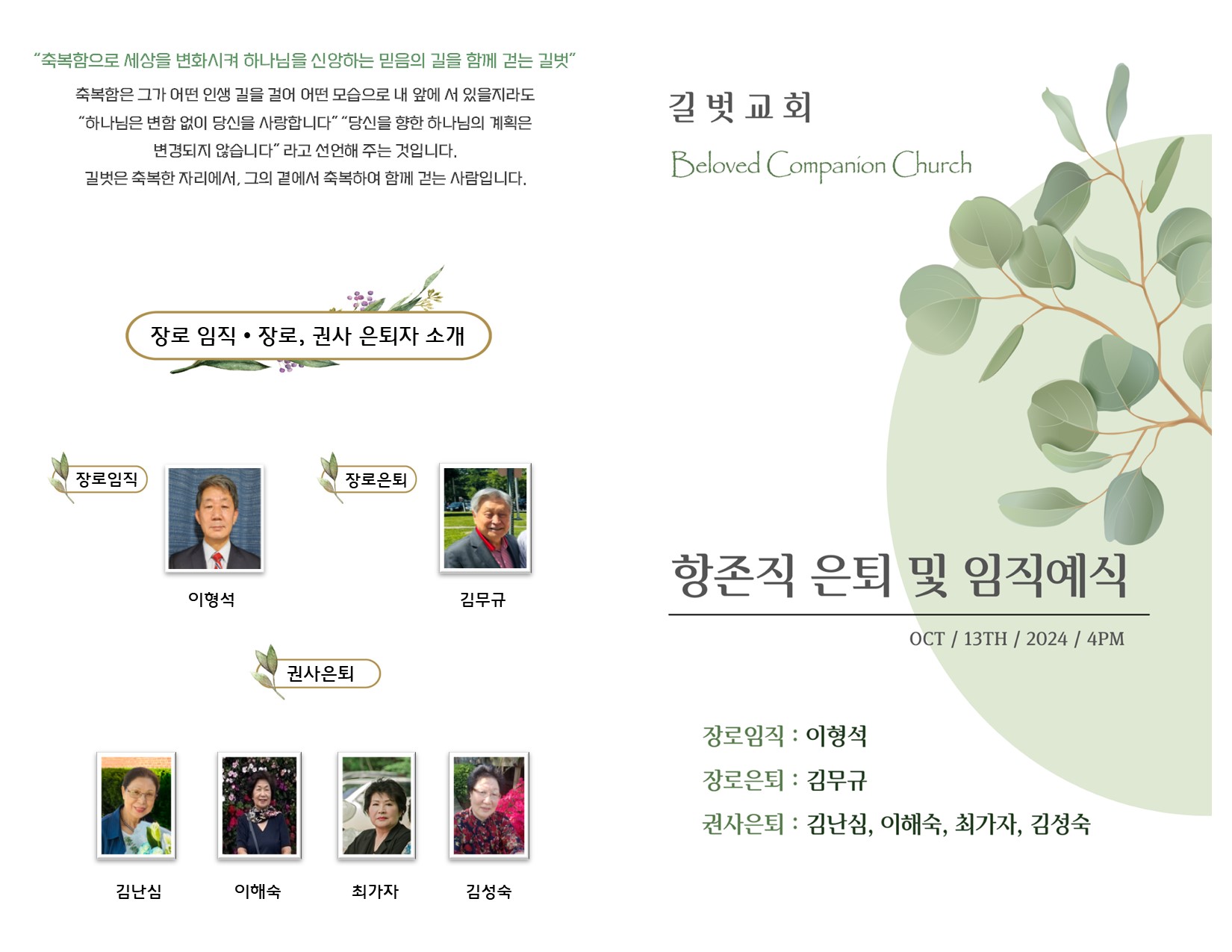 항존직 은퇴 및 임직예식 주보 10/23/24 Publish on October 15,2024 | 길벗교회 페이지 정보 작성자 길벗교회 댓글 0건 조회 1,897회 작성일 24-10-15 05:17 목록 본문 10월 13일 항존직 은퇴 및 임직예식 주보 10/13/24 이전글10월 20일 주일 예배 주보 24.10.25 다음글10월 13일 주일 예배 주보 24.10.15 댓글 0 댓글목록 등록된 댓글이 없습니다. 목록