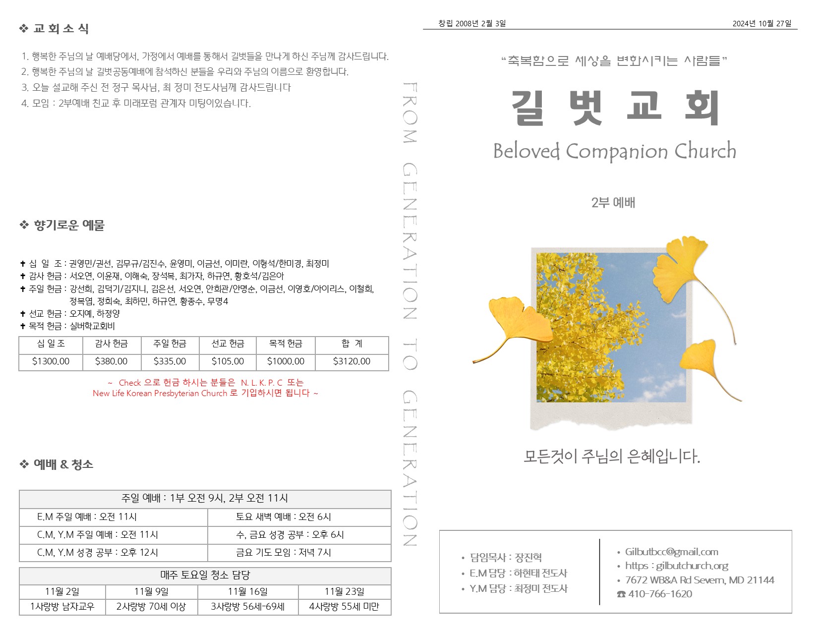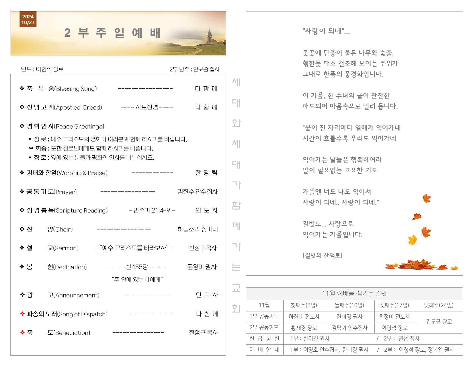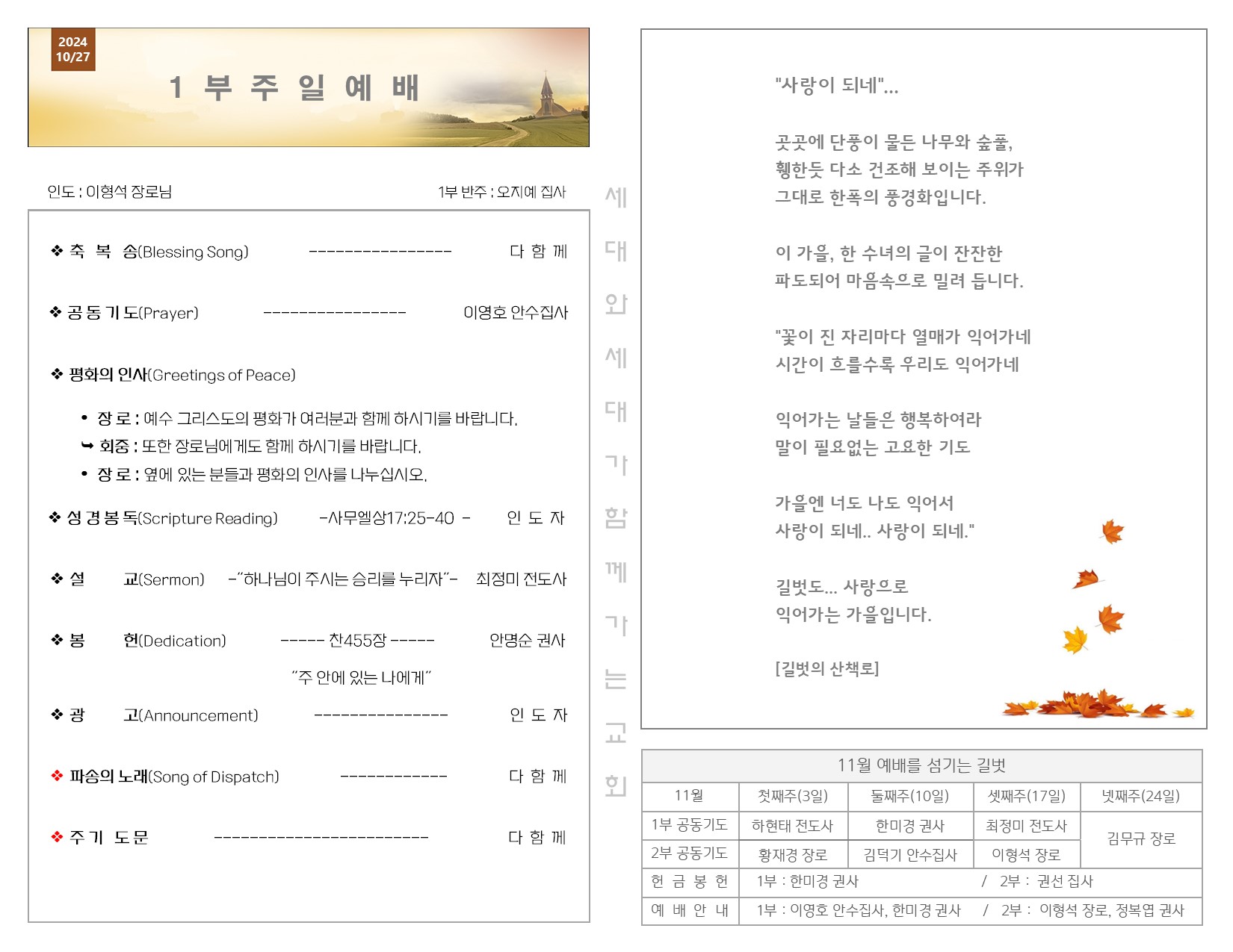 10월 27일 주일 예배 주보 Publish on October 29,2024 | 길벗교회 페이지 정보 작성자 길벗교회 댓글 0건 조회 1,847회 작성일 24-10-29 04:34 목록 본문 10월 27일 주일 예배 주보 이전글11월 3일 주일 예배 주보 24.11.06 다음글10월 20일 주일 예배 주보 24.10.25 댓글 0 댓글목록 등록된 댓글이 없습니다. 목록
