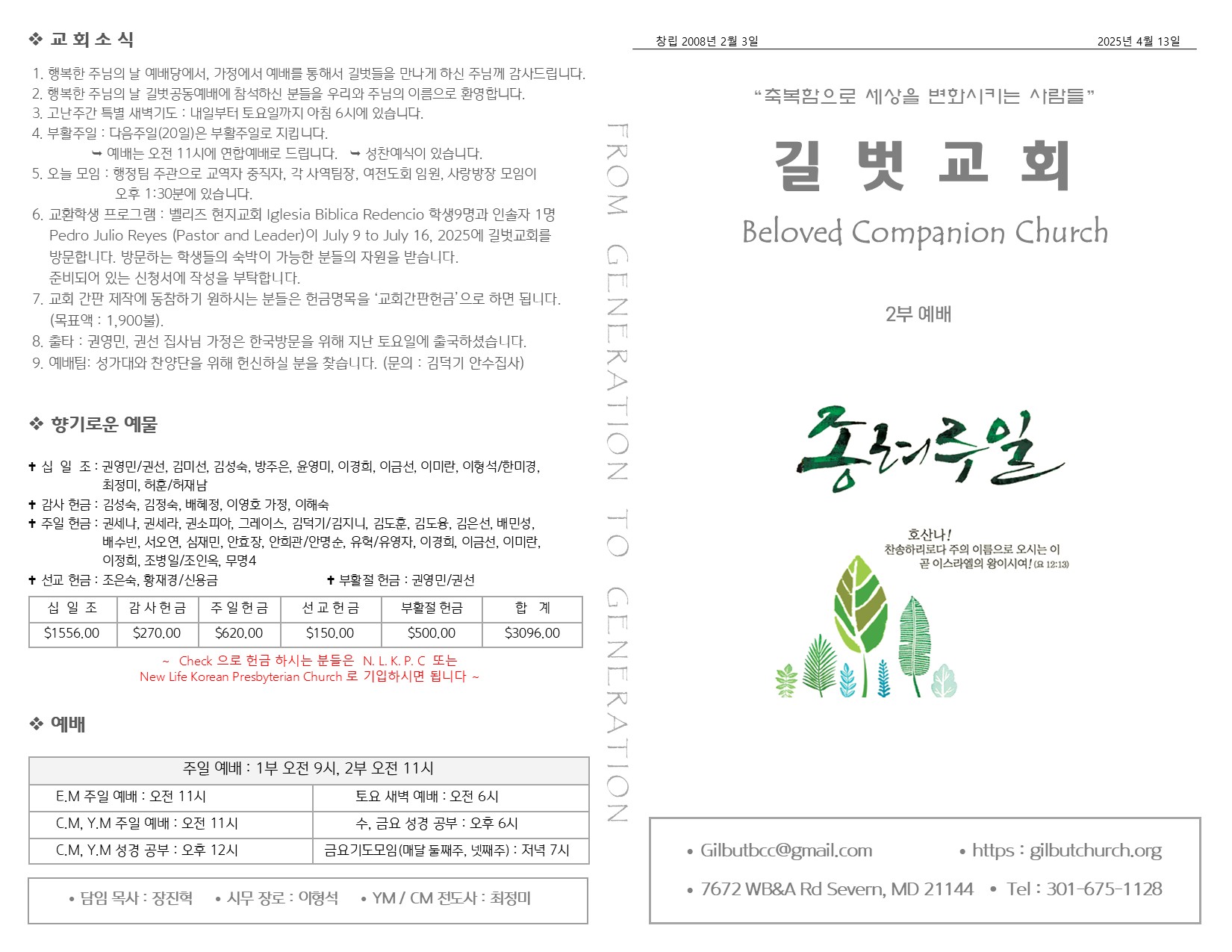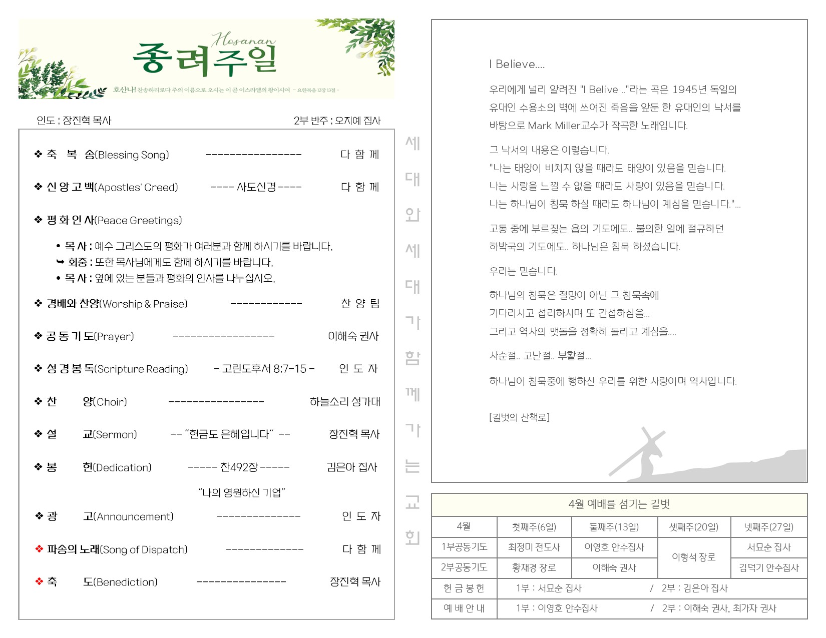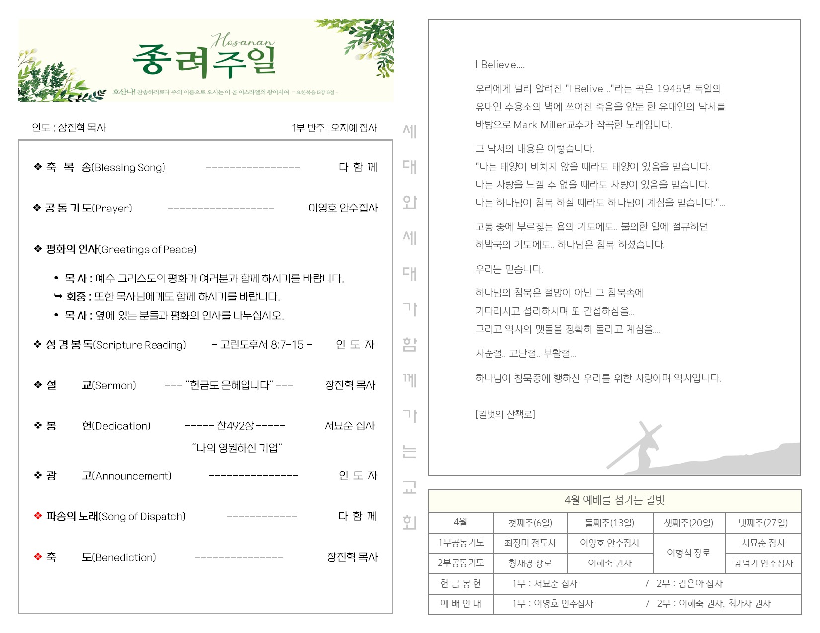4월 13일 주일 예배 주보 Publish on April 16,2025 | 길벗교회 페이지 정보 작성자 길벗교회 댓글 0건 조회 1,049회 작성일 25-04-16 04:30 목록 본문 4월 13일 주일 예배 주보 이전글4월 20일 부활절 주일 예배 25.04.22 다음글4월 6일 주일 예배 주보 25.04.08 댓글 0 댓글목록 등록된 댓글이 없습니다. 목록