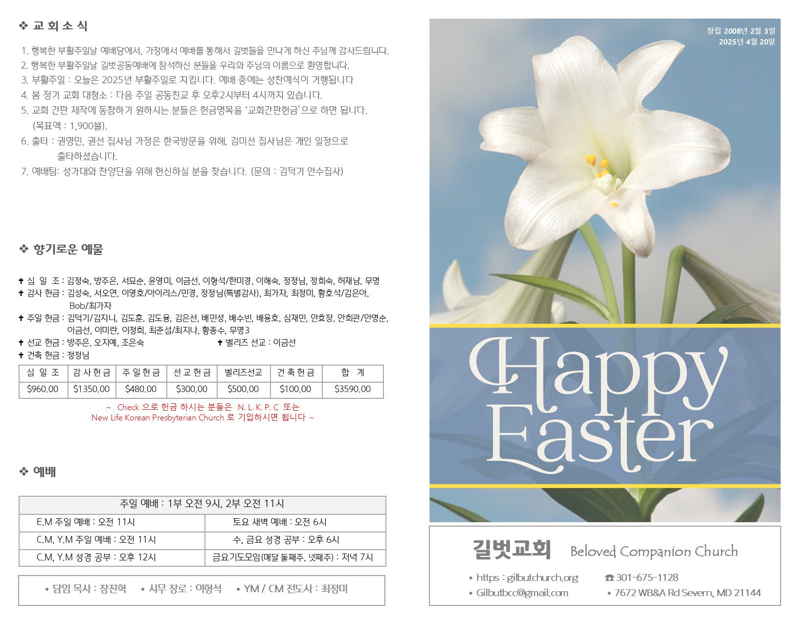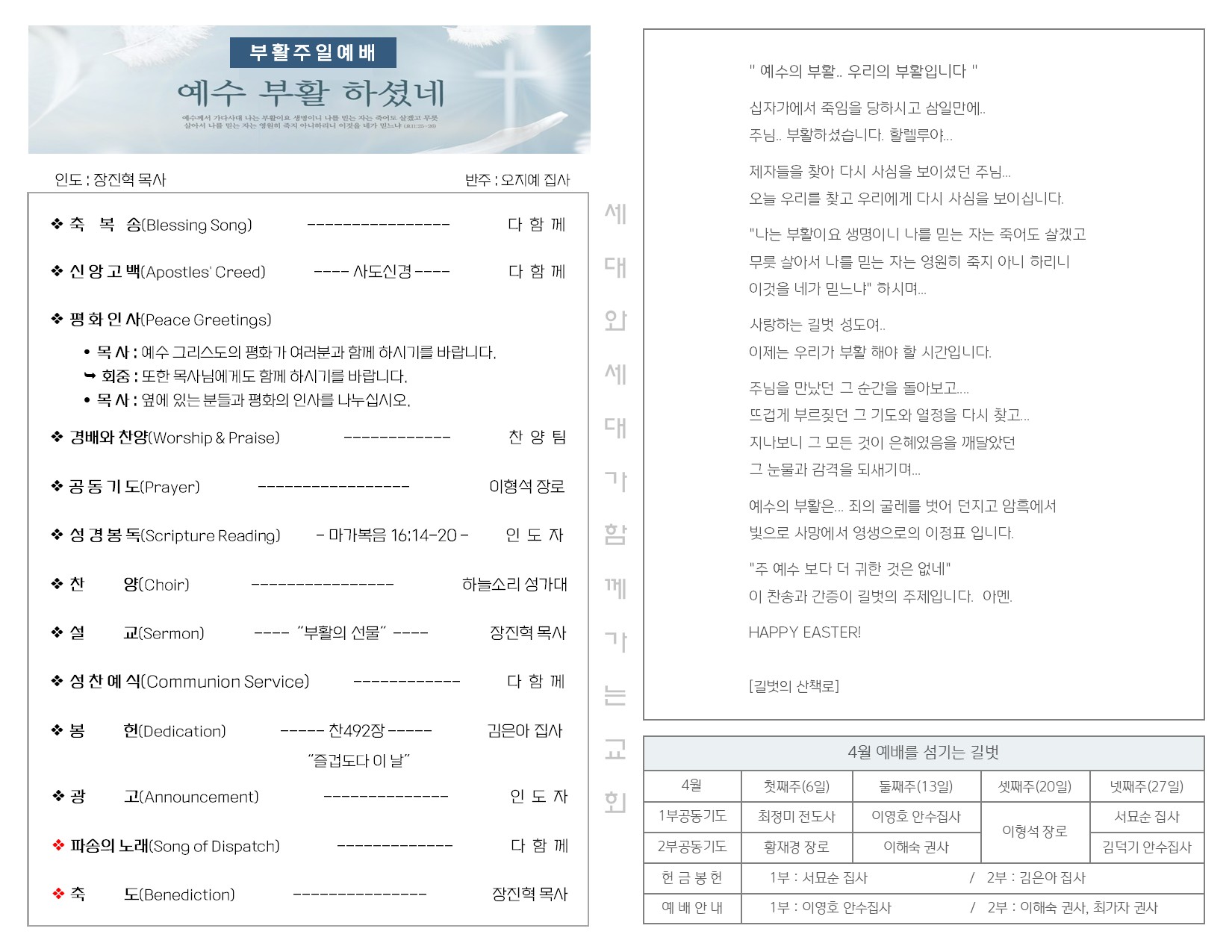 4월 20일 부활절 주일 예배 Publish on April 22,2025 | 길벗교회 페이지 정보 작성자 길벗교회 댓글 0건 조회 1,058회 작성일 25-04-22 04:30 목록 본문 4월 20일 부활절 주일 예배 이전글4월 27일 주일 예배 주보 25.04.29 다음글4월 13일 주일 예배 주보 25.04.16 댓글 0 댓글목록 등록된 댓글이 없습니다. 목록