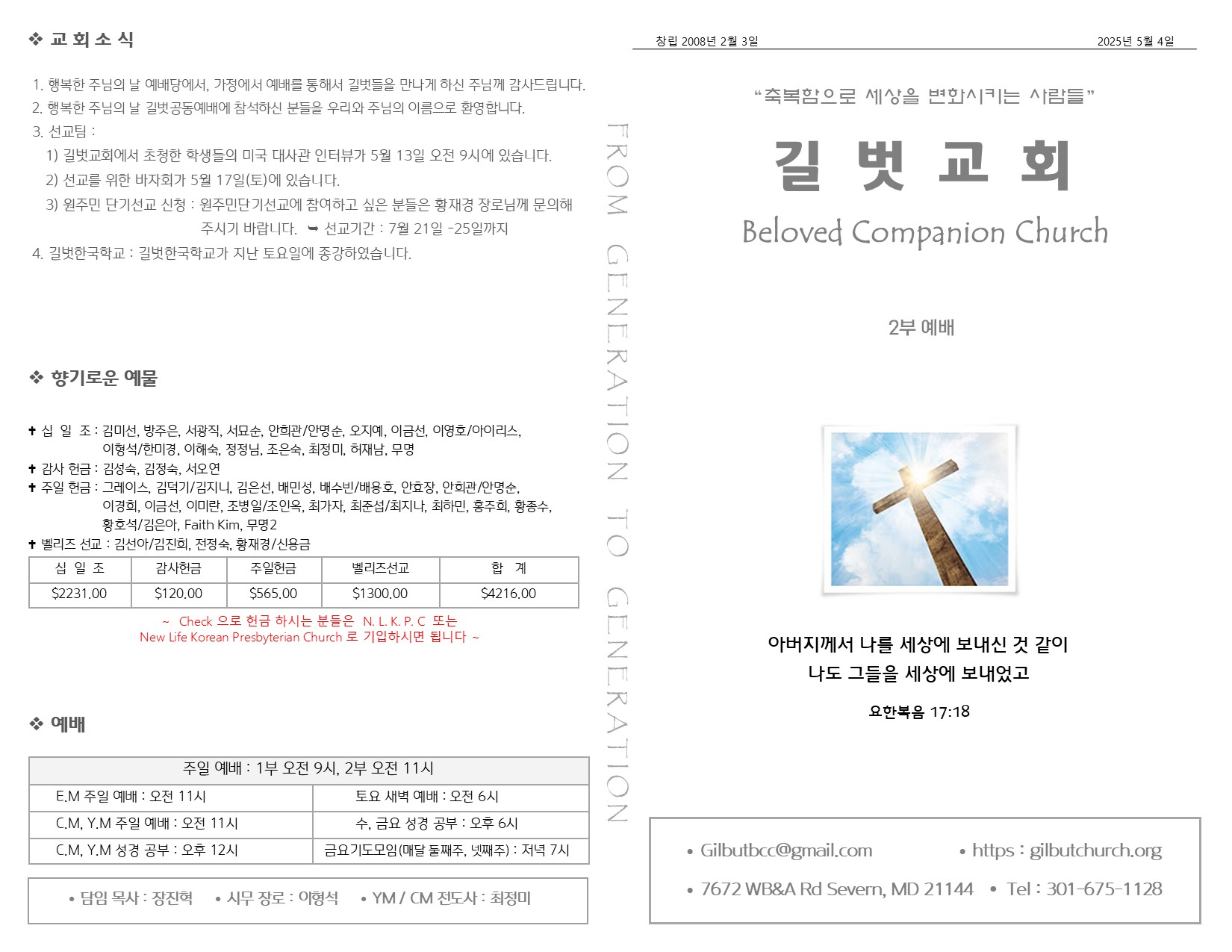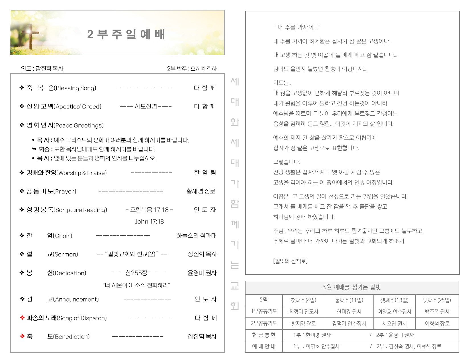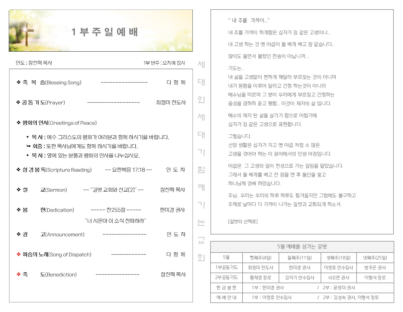 5월 4일 주일 예배 주보 Publish on May 07,2025 | 길벗교회 페이지 정보 작성자 길벗교회 댓글 0건 조회 897회 작성일 25-05-07 04:04 목록 본문 5월 4일 주일 예배 주보 이전글5월 11일 주일 예배 주보 25.05.14 다음글4월 27일 주일 예배 주보 25.04.29 댓글 0 댓글목록 등록된 댓글이 없습니다. 목록