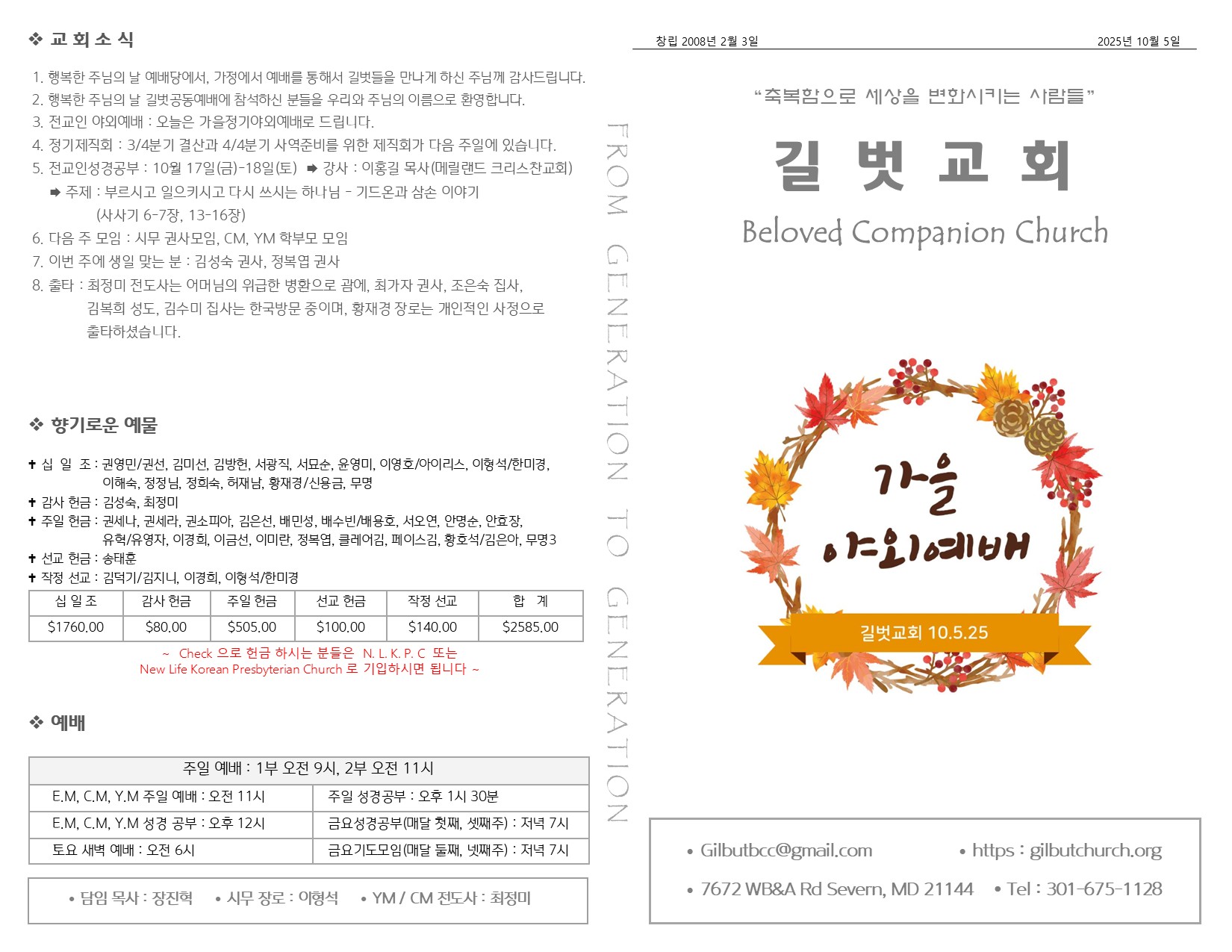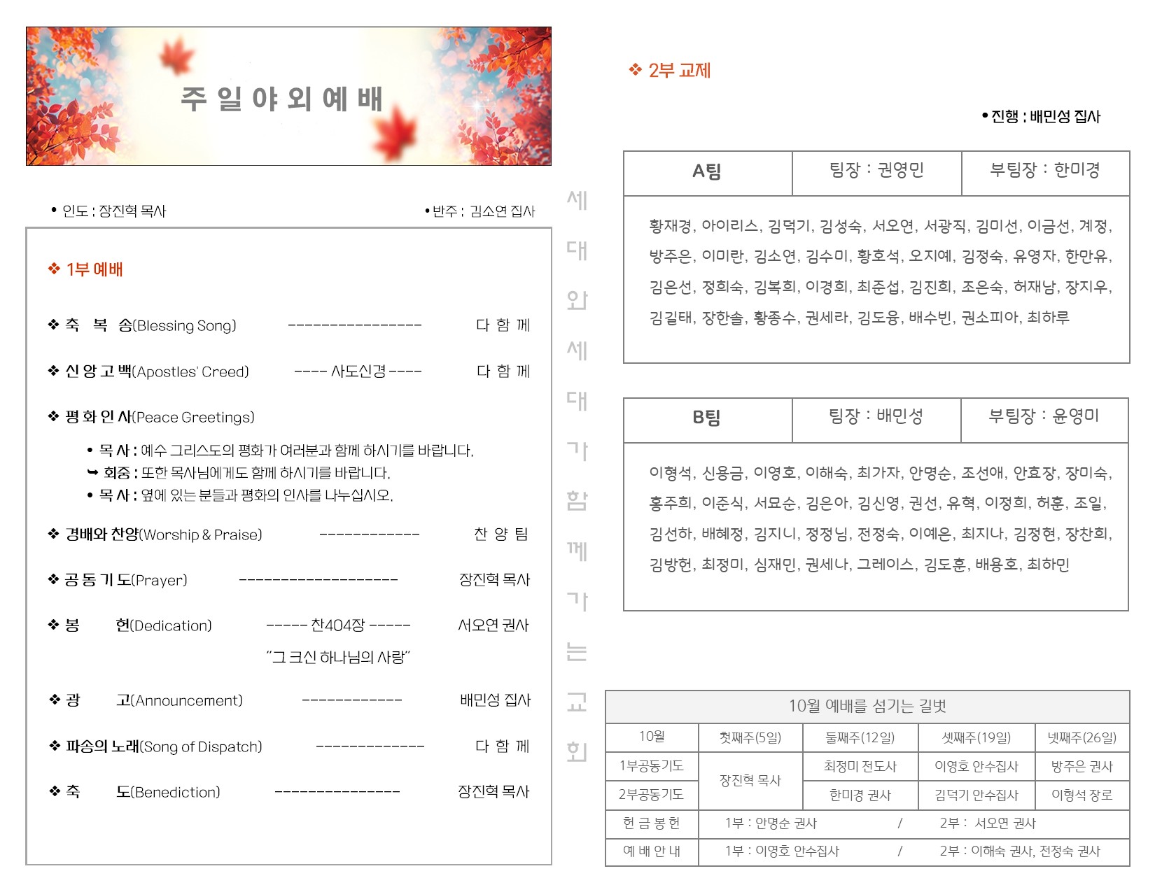 10월 5일 주일 예배 주보 Publish on October 07,2025 | 길벗교회 페이지 정보 작성자 길벗교회 댓글 0건 조회 358회 작성일 25-10-07 04:10 목록 본문 10월 5일 주일 예배 주보 이전글10월 12일 주일 예배 주보 25.10.14 다음글9월 28일 주일 예배 주보 25.09.30 댓글 0 댓글목록 등록된 댓글이 없습니다. 목록
