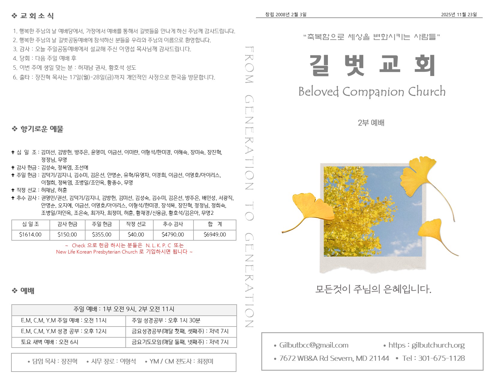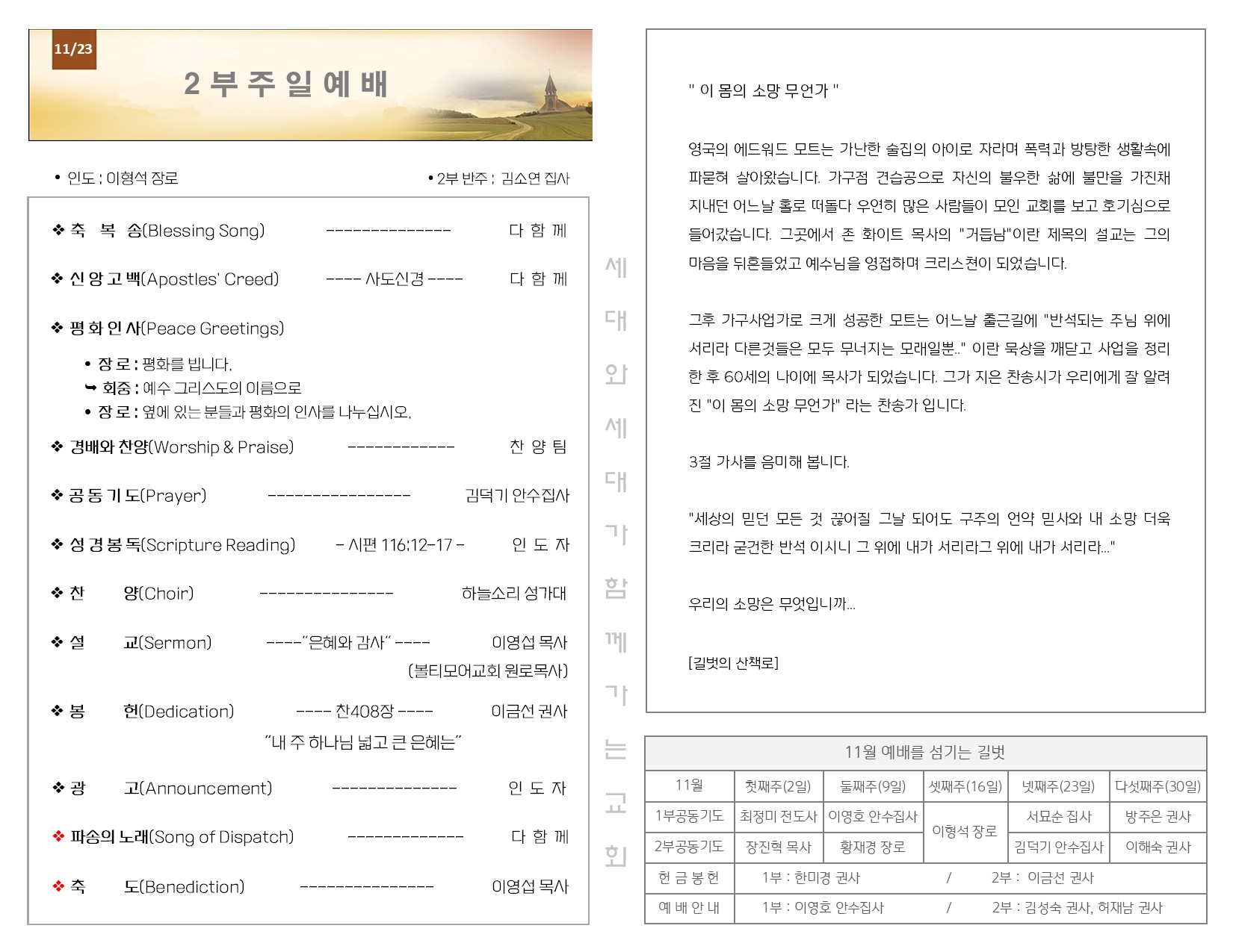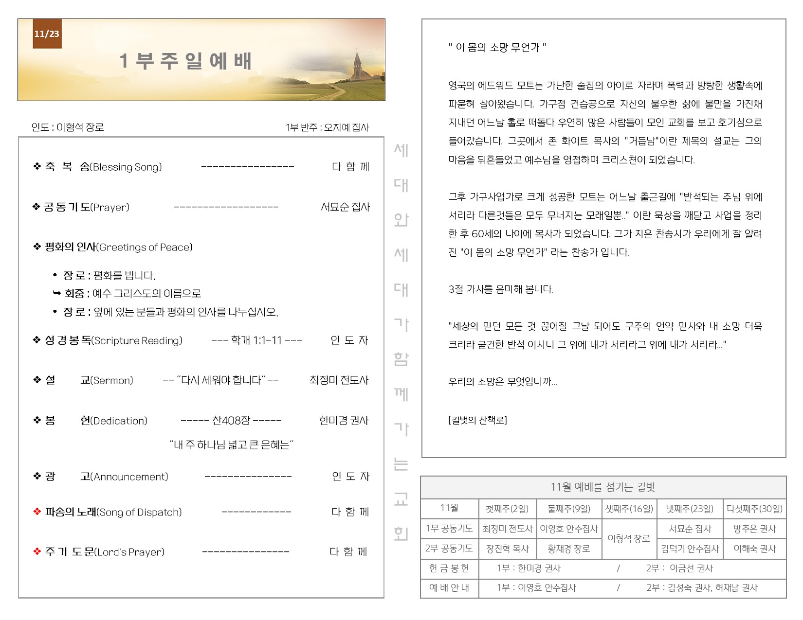 11월 23일 주일 예배 주보 Publish on November 25,2025 | 길벗교회 페이지 정보 작성자 길벗교회 댓글 0건 조회 58회 작성일 25-11-25 13:18 목록 본문 11월 23일 주일 예배 주보 이전글11월 30일 주일 예배 주보 25.12.02 다음글11월 16일 추수감사주일 예배 주보 25.11.18 댓글 0 댓글목록 등록된 댓글이 없습니다. 목록