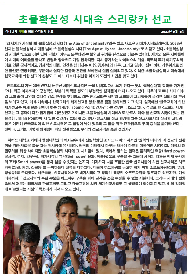 스리랑카 선교편지 페이지 정보 작성자 길벗교회 댓글 0건 조회 924회 작성일 23-09-06 04:38 목록 본문 중보기도는 성령하나님과 나와 선교사님을 하나로 묶어 선교사역을 하는 것입니다. 스리랑카 선교지와 하웅원, 정미연 선교사님을 위해 기도부탁합니다. 이전글가을 실버 학교 포스터 23.09.26 다음글스리랑카 선교편지 23.07.11 목록 댓글 0 댓글목록 등록된 댓글이 없습니다.