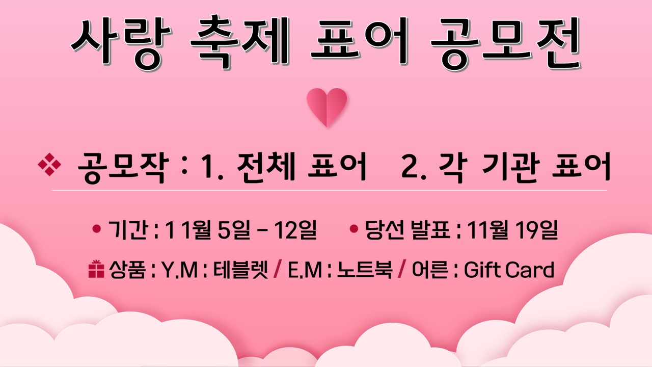 2023' 사랑축제 표어 공모전 Publish on November 07,2023 | 길벗교회 페이지 정보 작성자 길벗교회 댓글 0건 조회 2,199회 작성일 23-11-07 06:03 목록 본문 2023' 사랑축제 표어 공모전 이전글사랑축제 표어 공모 당선작 23.11.21 다음글2023' 전교인 가을 수련회 23.09.19 댓글 0 댓글목록 등록된 댓글이 없습니다. 목록