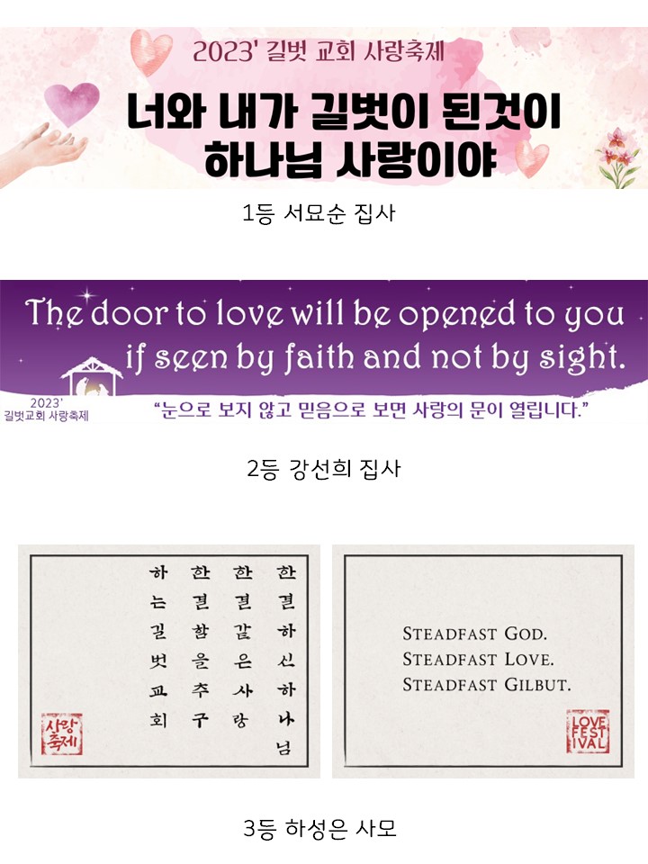 사랑축제 표어 공모 당선작 Publish on November 21,2023 | 길벗교회 페이지 정보 작성자 길벗교회 댓글 0건 조회 1,189회 작성일 23-11-21 12:36 목록 본문 사랑축제 표어 공모 당선작 이전글Manna24 장진혁 목사님 23.11.29 다음글2023' 사랑축제 표어 공모전 23.11.07 댓글 0 댓글목록 등록된 댓글이 없습니다. 목록