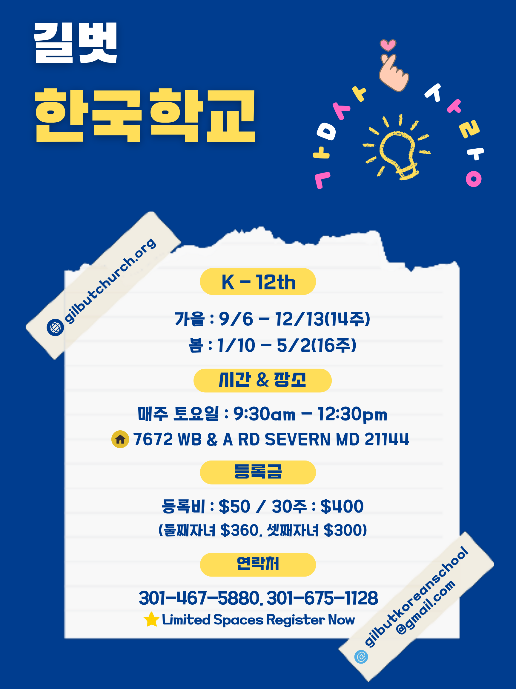 2025-2026 길벗 한국학교 포스터 Publish on August 12,2025 | 길벗교회 페이지 정보 작성자 길벗교회 댓글 0건 조회 802회 작성일 25-08-12 04:19 목록 본문 2025-2026 길벗 한국학교 포스터등록링크 : https://forms.gle/msvDXen4vBGZvqpt8 이전글길벗교회 전교인 성경공부 25.09.09 다음글YM SUMMER RETREAT 25.07.10 댓글 0 댓글목록 등록된 댓글이 없습니다. 목록